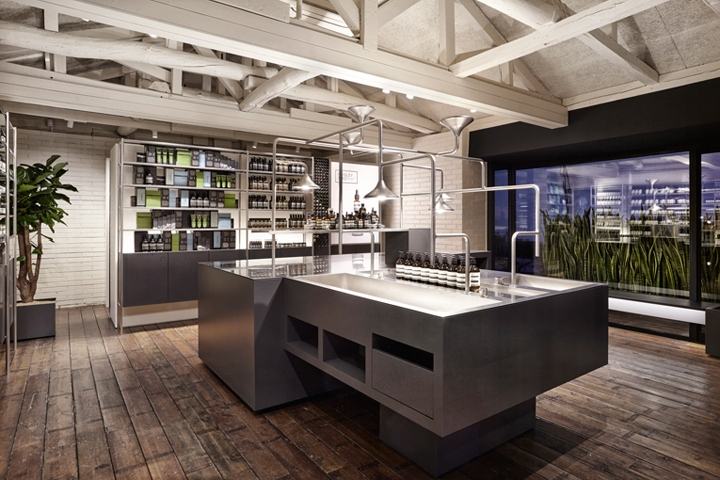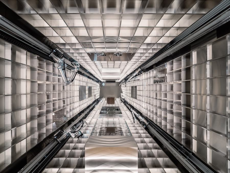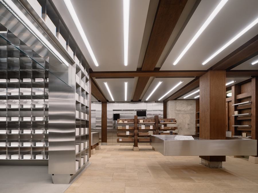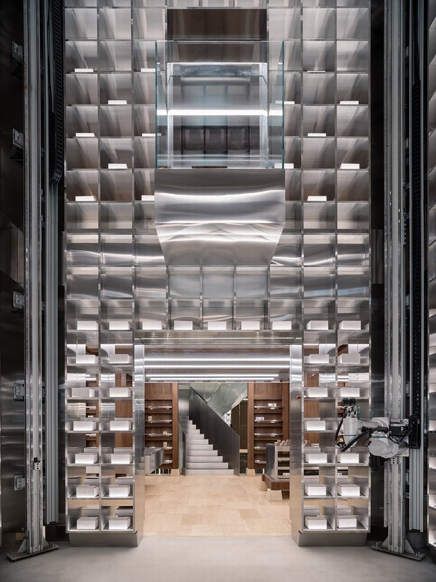 让人联想到亚洲古色古香的仓库,由古老的石头地板、厚重的木制家具和墙壁组成,放置在坚固的石块上。在这一层,未来也在眼前。不锈钢垂直仓库,鼓励你与机器人和建筑的垂直性接触。与此同时,展示岛、货架和收银台就像你熟悉的街角商店一样,欢迎客人在空间中移动,舒适而无抑制。
