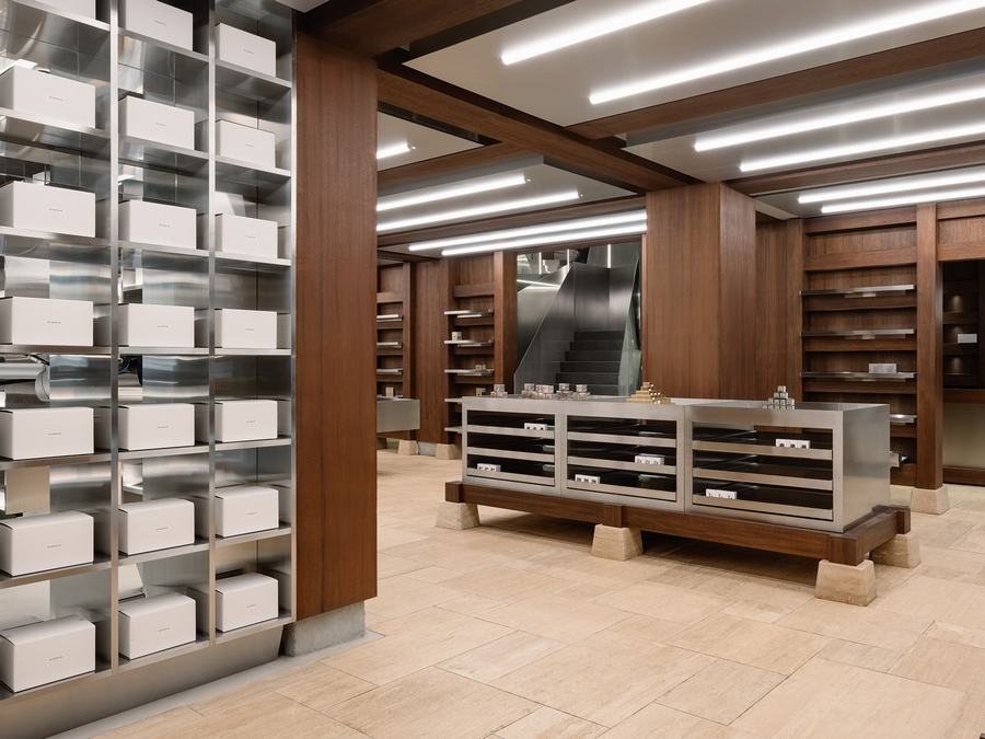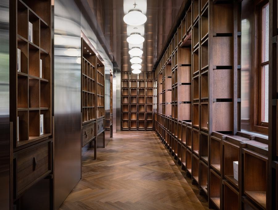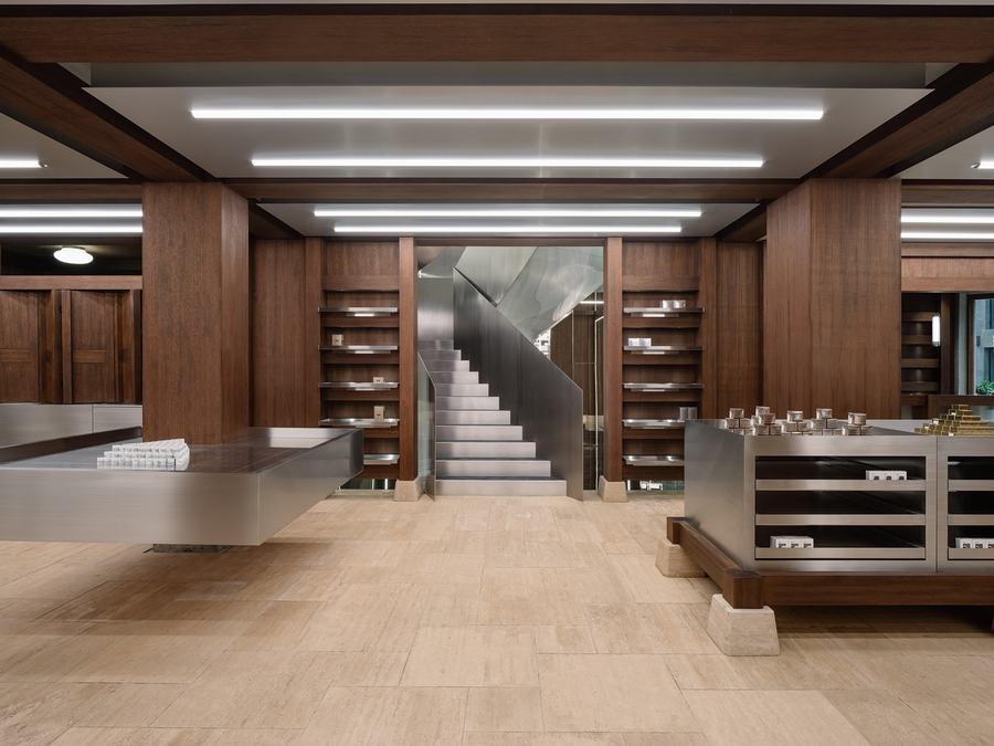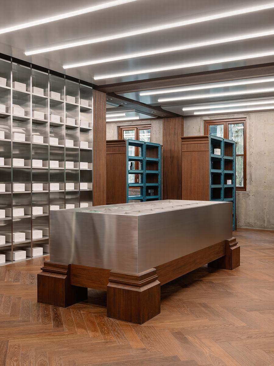 通过镜像楼梯到达二楼,给人一种更加保守的印象。一进门,传统的钢架排列整齐,以垂直仓库为核心,让我们想起品牌的起源。在这里,一扇窗户和一个小阳台让客人体验到它的深邃轻盈。与此同时,人字形木地板、装饰性木造型和阳极氧化铝暗示了历史上的时间层次。