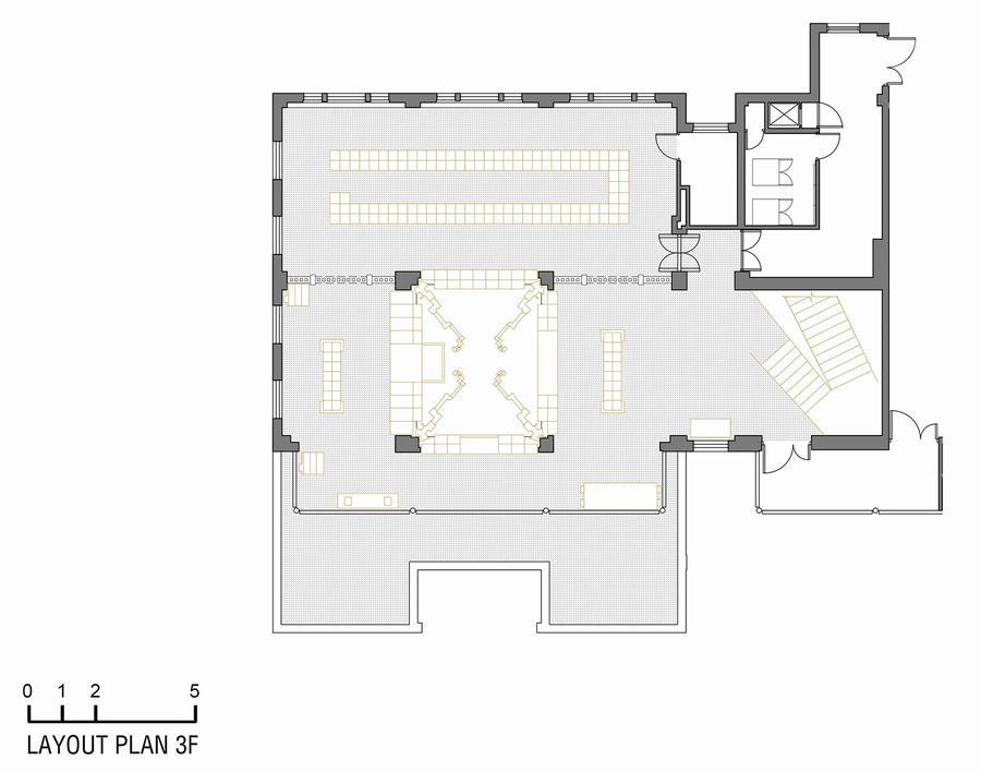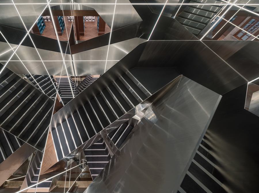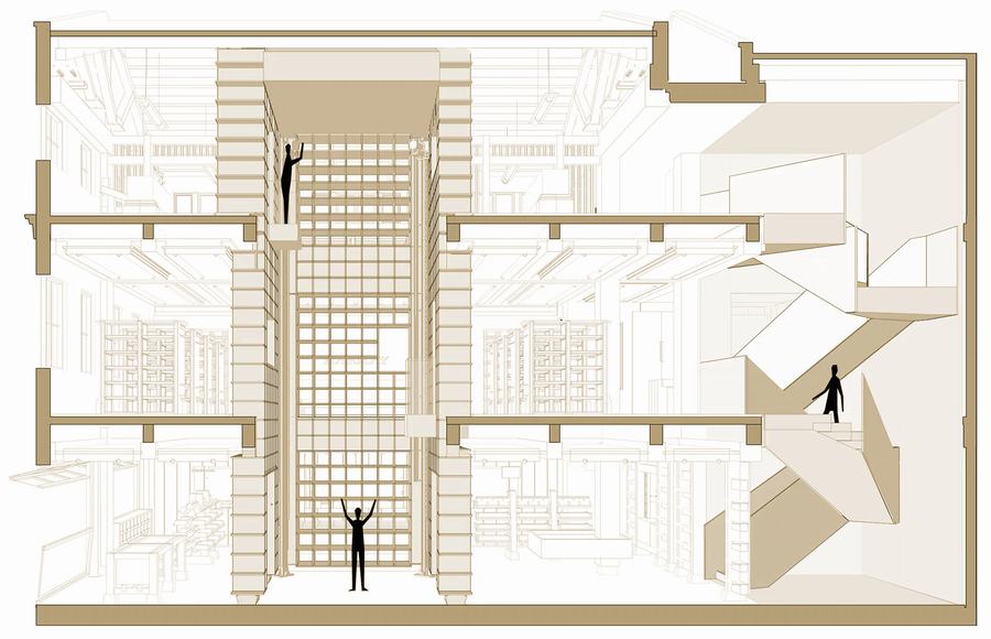 建筑的三层楼代表了不同的历史时刻。在空壳中,我们对材料、空间体验和细节进行分层,这些都源于他们独特的历史时期。建筑中插入了两个新的垂直元素,及时地将这些层连接起来。第一个是垂直存储核心,机械机器人沿着3层楼组织货物。第二个是体验式楼梯,让人们像时间容器一样穿梭于建筑之中。无论是引入一门新的语言、一段对话,还是由此产生的精确的个人时间层。