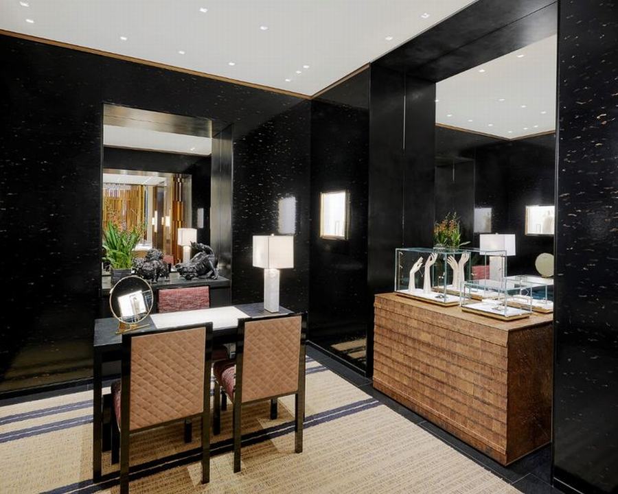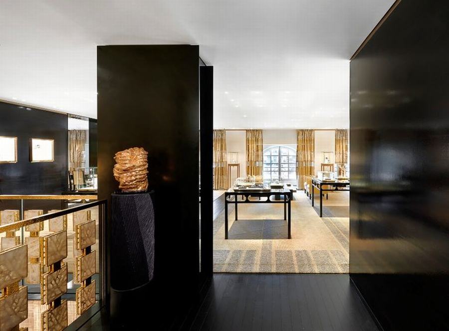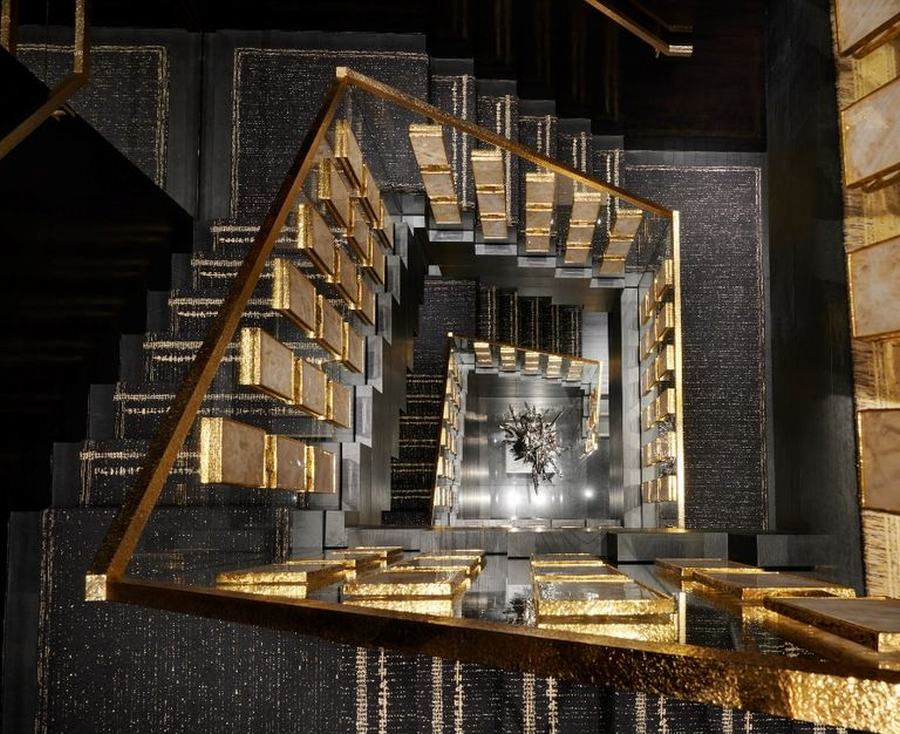 进入在电梯的右侧,沿着线条简洁、装饰着水晶和镀金青铜矩形的楼梯底部,摆放着由著名艺术家Joel Morrison创作的当代银亮钢雕塑作品 “Coco Chandelier”,这件作品也是特别为香奈儿chanel腕表与高级珠宝店的重装开幕而创作的。