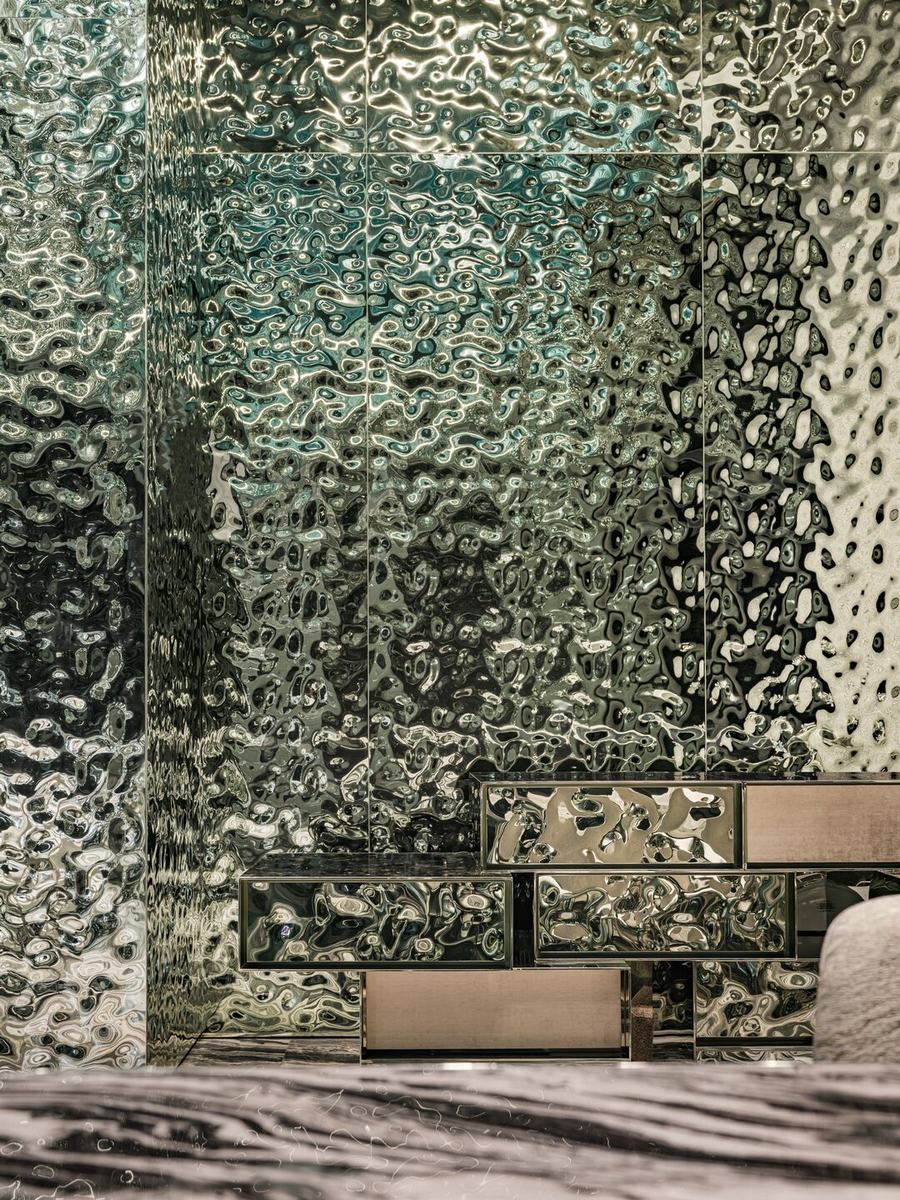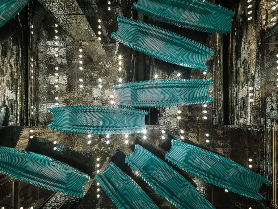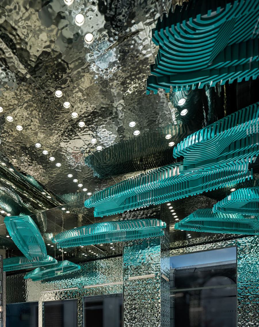船的外观和人们心目中的船是不一样的。它们表现为波纹图案,因为它们在水中的反射是断开的,这出现在水滴落入河中之后。天花板的部分模仿了河流表面的起伏,用弯曲的银色材料呈现,并延伸到墙壁。镜面的处理进一步恢复了“水之城”的独特视觉体验。