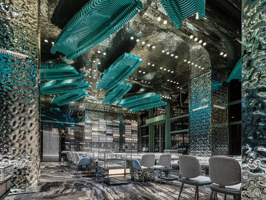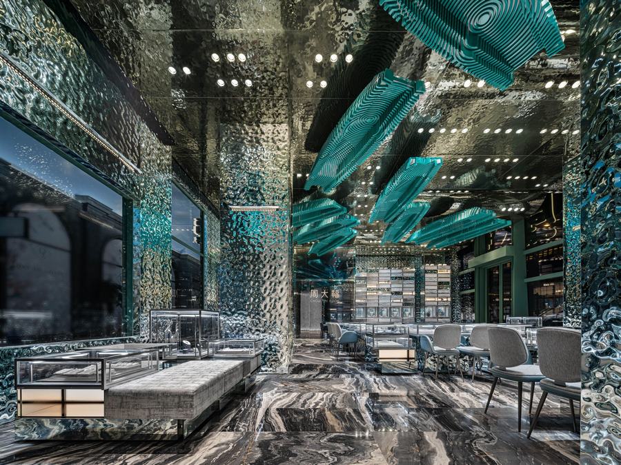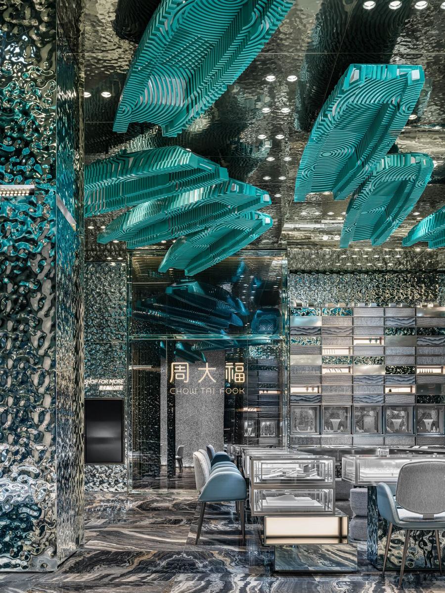 我们将水的形状形象化,使整个空间被水包围。当人们进入珠宝店,就好像进入了一个平静的水下世界。我们为我们的客户创造了一个主要的设计概念“礼物”主题系列,因为人们通常把珍贵的珠宝放在盒子里作为礼物送给他们的爱人。此外,我们在每个店铺中加入各种元素,丰富设计思路和视觉效果。因此,在这家以“水之城”为理念的商店里,你可以看到很多礼盒陈列在墙上和地板上。结合礼盒周围闪闪发光的墙壁,这些装满珠宝的盒子似乎毫不费力地漂浮着。