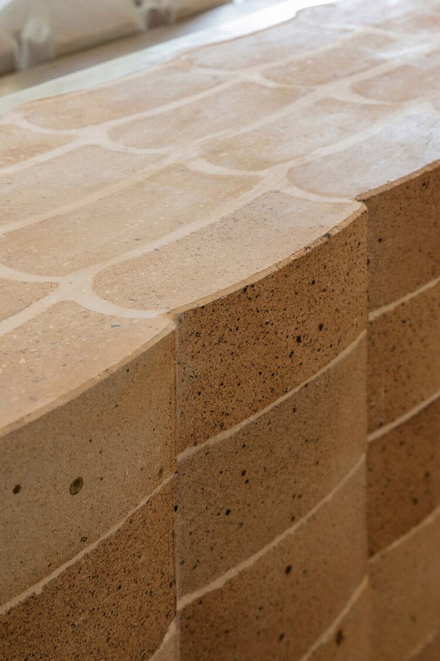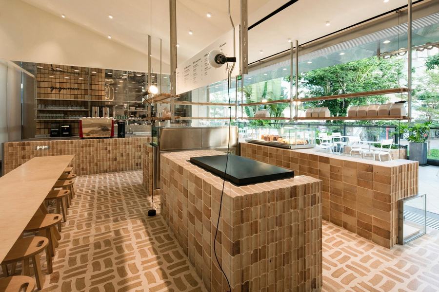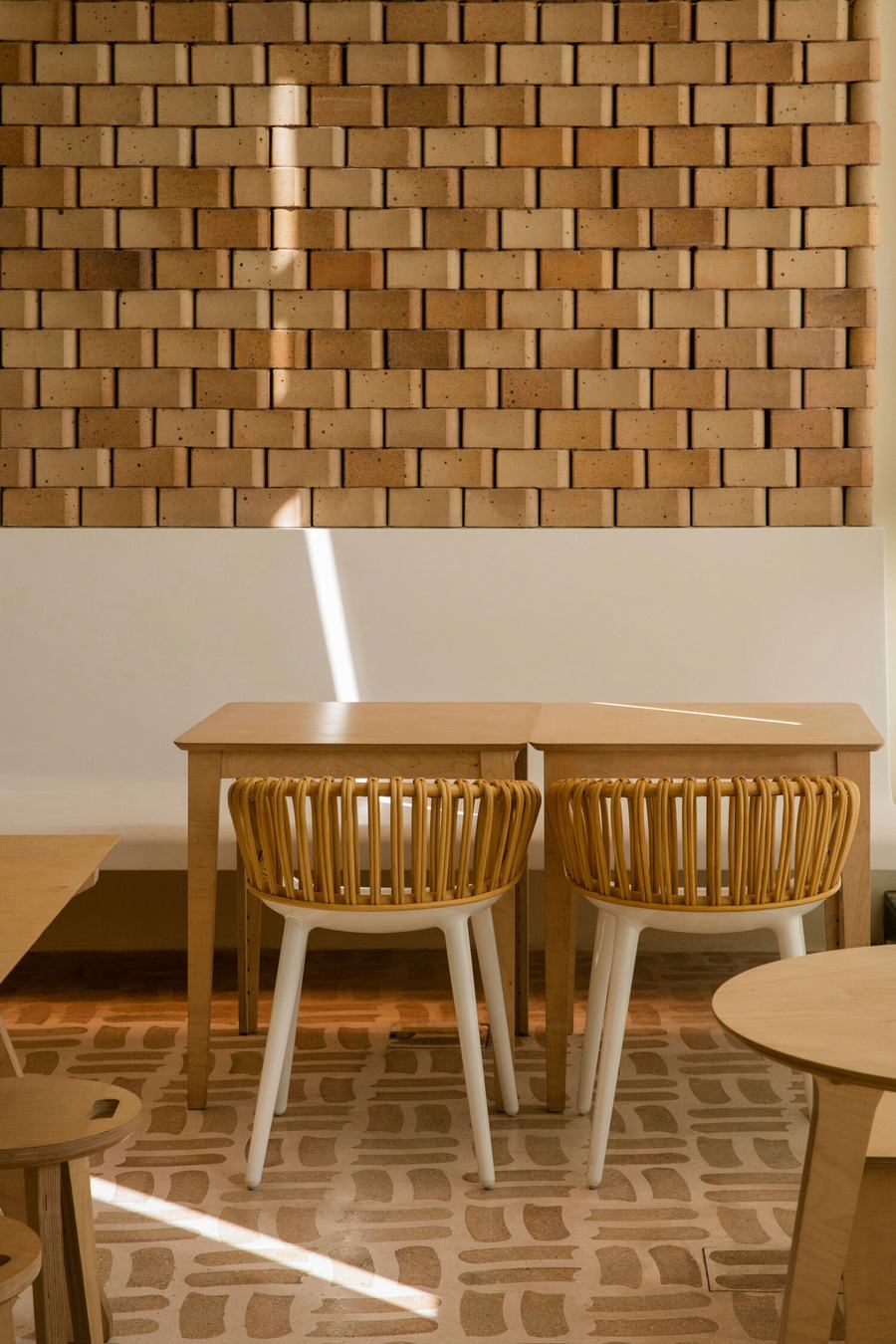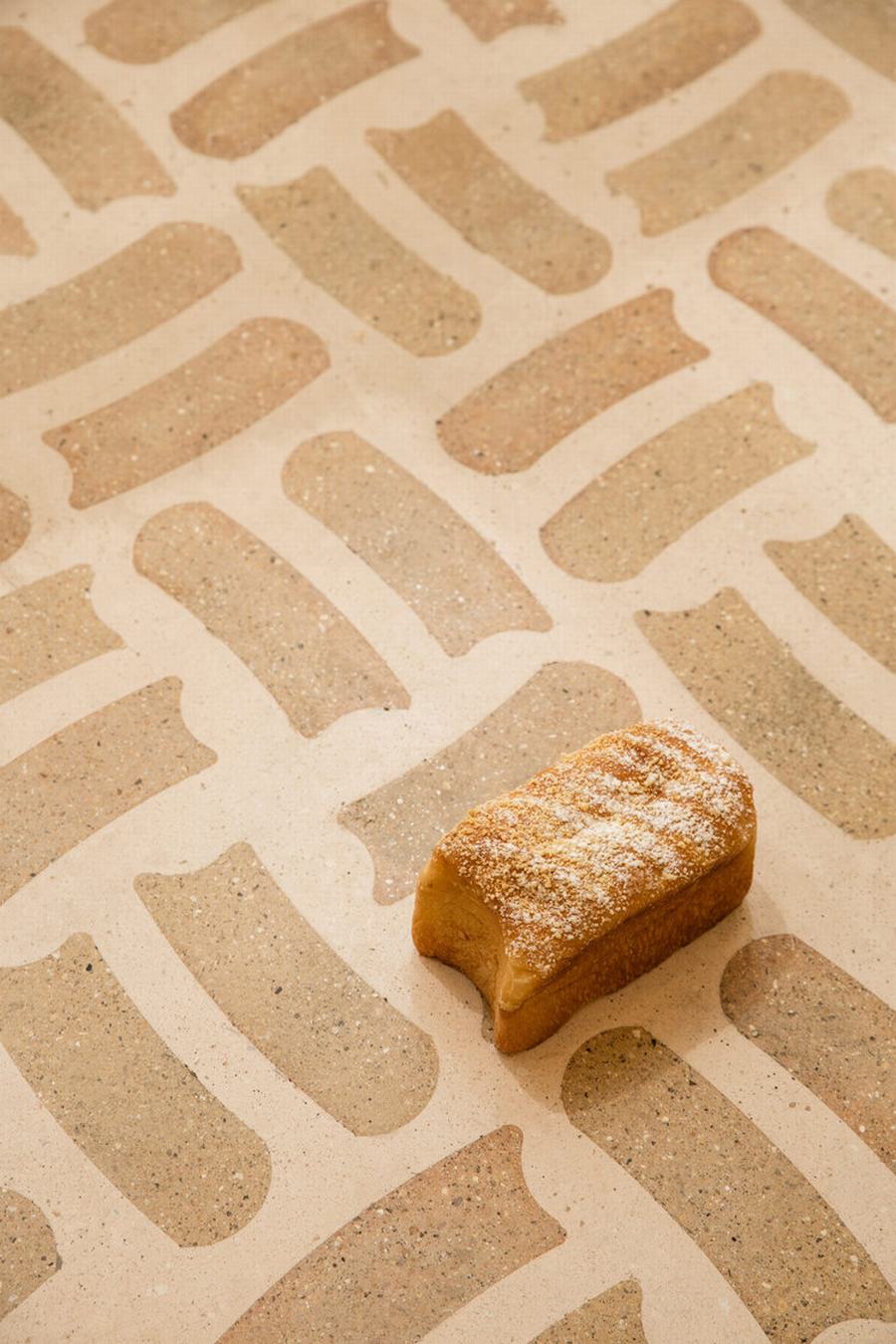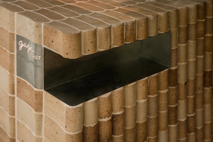 toast主题的元素渗透到空间中,整个空间叙事围绕着一个特殊形状的砖。有些砖是在金属模具中塑形并在高温下烘烤的,所以砖的制作过程与面包或烤面包的过程没有什么不同。我们与工匠密切合作,在砖的表面创造出一种独特的纹理,将骨料与混凝土精心结合,形成一种独特的表面处理,使砖看起来几乎像一片面包的外壳。