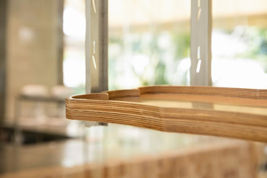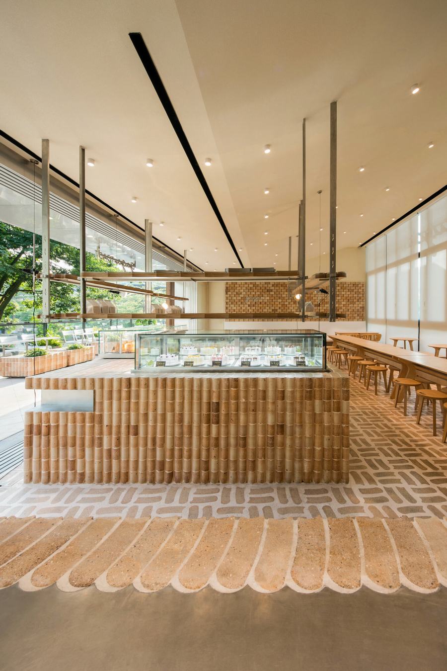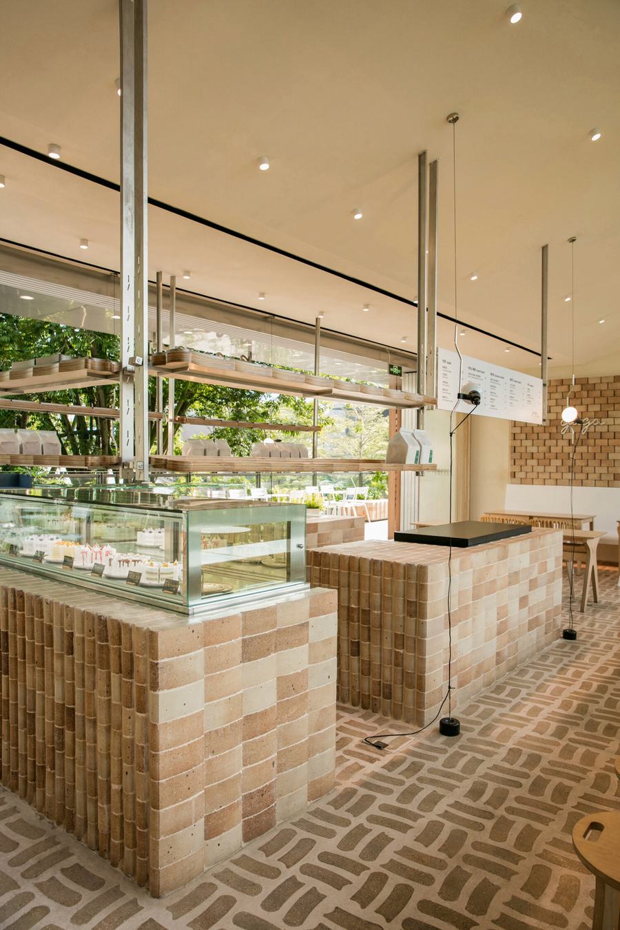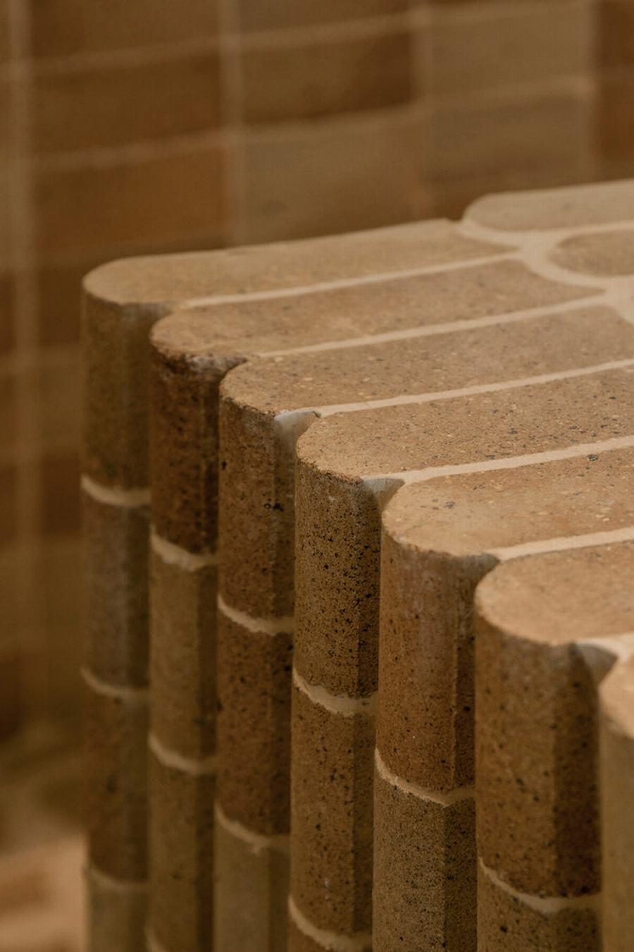 toast主题的元素渗透到空间中,整个空间叙事围绕着一个特殊形状的砖。有些砖是在金属模具中塑形并在高温下烘烤的,所以砖的制作过程与面包或烤面包的过程没有什么不同。我们与工匠密切合作,在砖的表面创造出一种独特的纹理,将骨料与混凝土精心结合,形成一种独特的表面处理,使砖看起来几乎像一片面包的外壳。