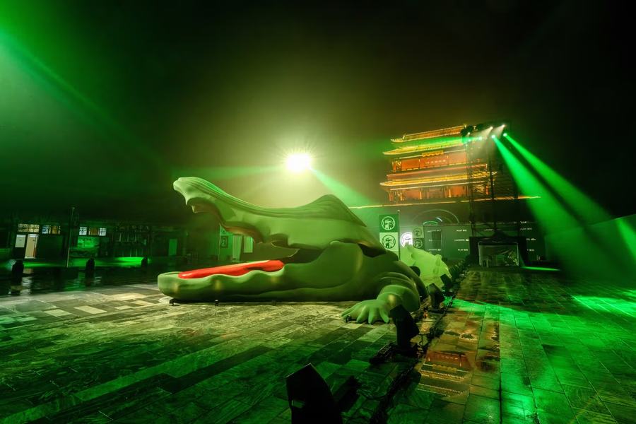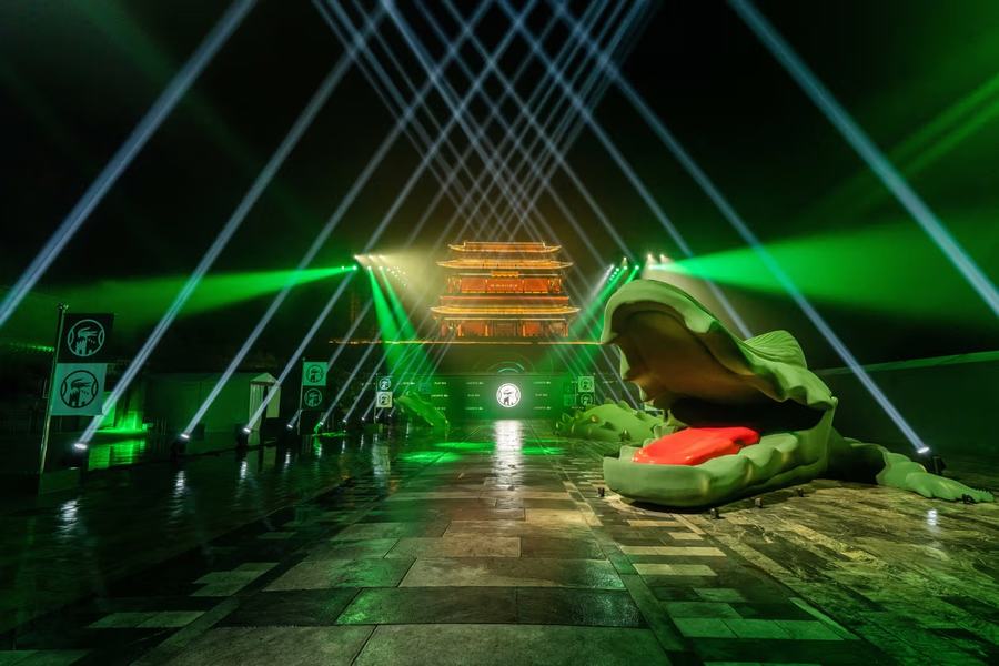 居庸关,春风和煦,万物复苏。当夜幕降临,长城的雄伟身姿在灯光的映衬下更显神秘与庄严。Lacoste以“Play Big”为主题,将这座古老的历史建筑变成了一个充满现代感与活力的网球场。巨大的绿色鳄鱼旗帜在夜空中飘扬,与长城的青石砖瓦形成了鲜明的对比,仿佛在诉说着一段跨越时空的传奇故事。而大型鳄鱼灯光装置、巨大网球拍和裁判椅等网球元素的加入,更是将这一场景推向了高潮,让长城在Lacoste标志性的绿色光芒中焕发出了新的生机。