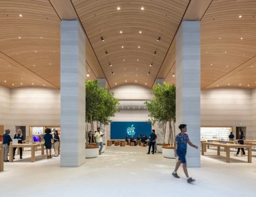 Apple Brompton Road是苹果和Foster + Partners的另一个紧密合作项目,现在已经开放。新开的骑士桥商店位于哈罗德百货公司和哈维·尼科尔斯百货公司之间。从落地窗到天花板的拱形窗户透出的自然光充满了这里。 苹果布朗普顿路店由一层组成,占地面积平方。七米高的体量以起伏的木材天花板为特色,有四米宽的落地拱形窗户,框起八棵优雅的榕树。这些树木参考了伦敦著名的海德公园,海德公园距 [...]…