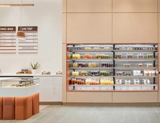 在舒适的室内购物中心 Village Juicery抓住了一个 具有传统灵感立面的街景零售空间的精神 室内设计是充满活力的果汁的背景 通过暴露建筑细节和熟悉的材料 如赤陶土和天然石板 反映了产品的纯净和诚实 木质展架以赤陶土为背景 产品错落有致的摆设 赤陶土色在空间中非常具有识别度 售卖体验区、冷藏展示区、常温产品陈列区 几个主要展示功能合理的安排在空间中…