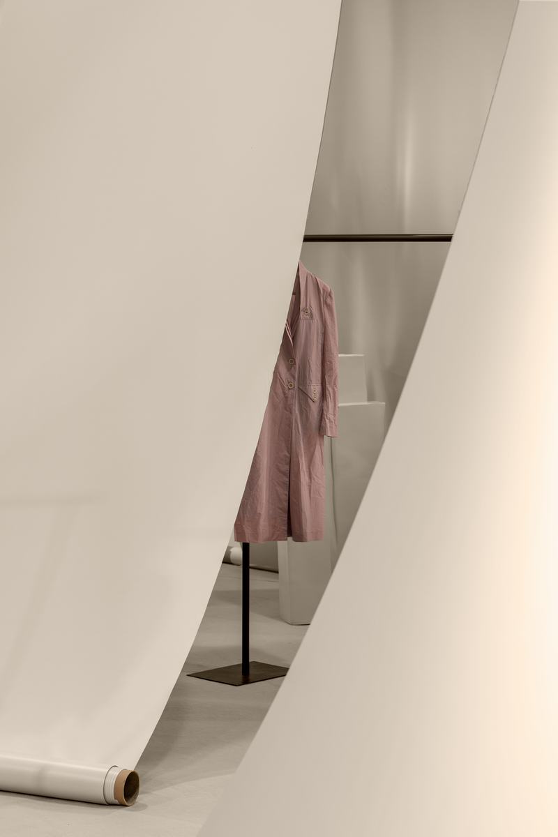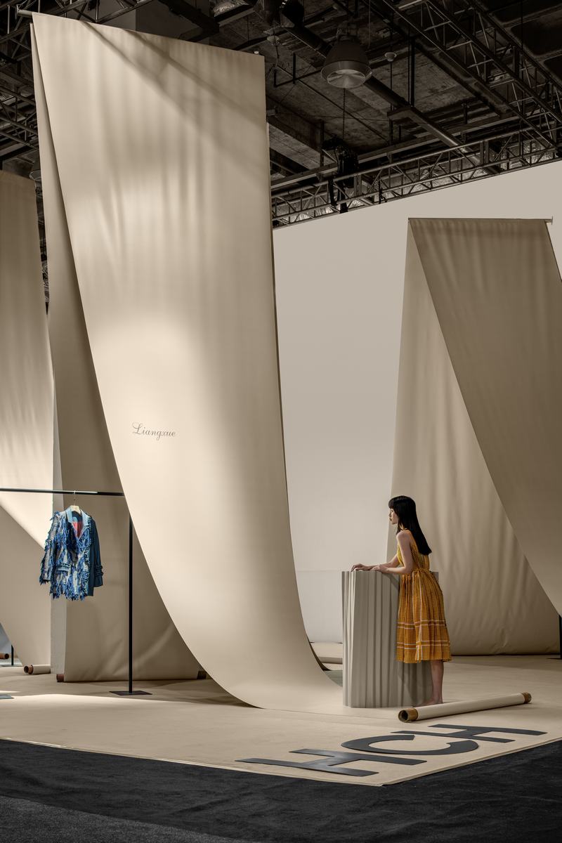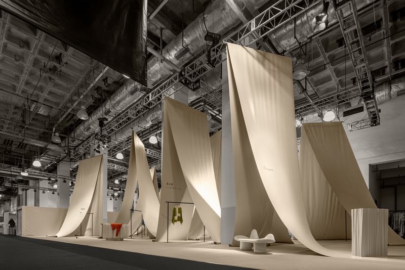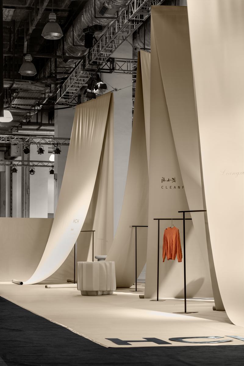 考虑到场地的特殊性和原始的特性,设计师设计了一个“柔软的森林”,材料是毛毡等织物。毛毡的柔软打破了柱子的规则,带来一种模糊而梦幻的空间感。“毛毡织物墙”从高高的天花板上垂挂下来,延伸到地板上。毛毡织物的垂挂形成瀑布般自然流动的线条和平面;与毛毡里面展示的服装相互补充和相互影响。