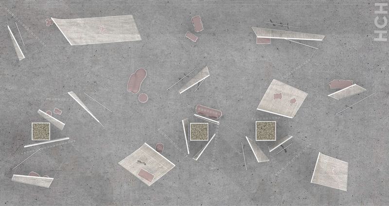 毛毡织物的两端固定在地面上,桁架从中间“拉起”织物,让织物自然地悬垂,创造一个独特的空间。桁架提起柔软的织物,一个灵活的“迷宫”出现在空间里面。尽管有目的性,但织物的布局是不规则的,有些形成开放空间,有些形成半遮蔽的“庇护所”。