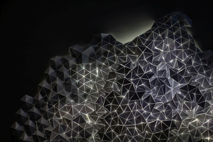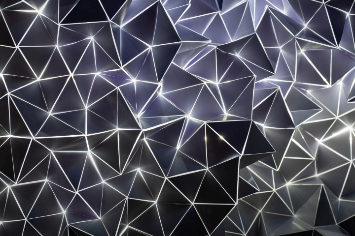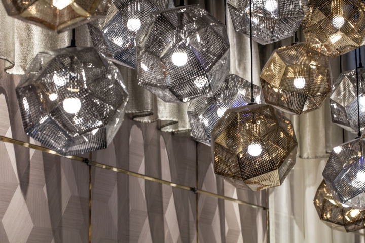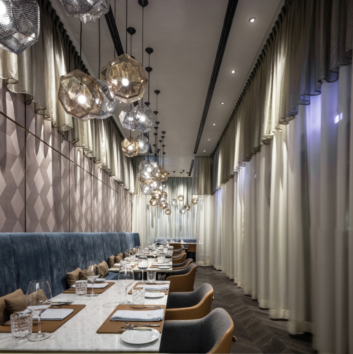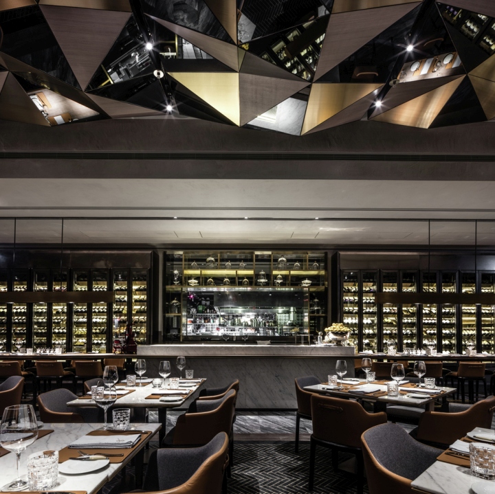 餐厅内六米层高天花由参数化三维几何镜面、黄铜和灰色木材组成,巧妙折射着餐厅各个局部和身处其中的就餐者,设计师有意压缩了一些空间,却带来足够的灵动与生机。