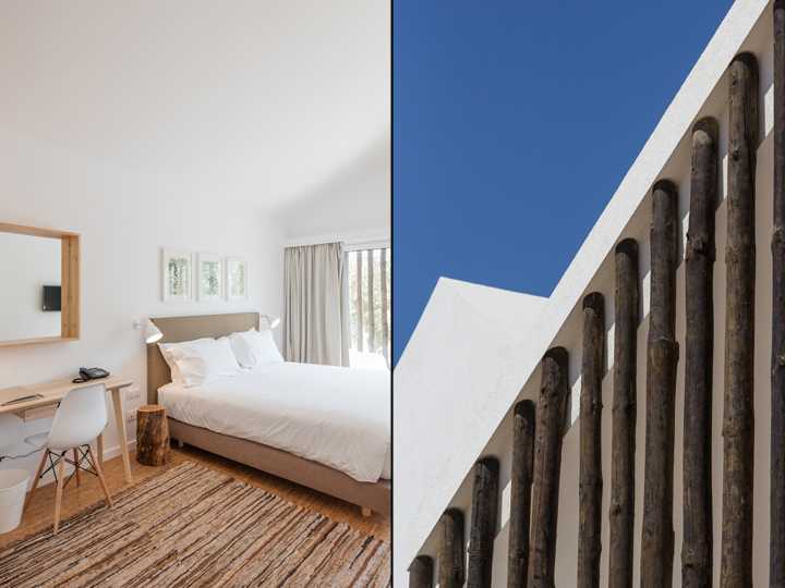 在立面上使用的木质原木与周围景观的对话,与这些白色建筑的简单和精致的几何对比。