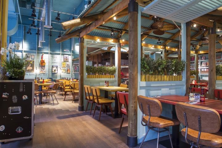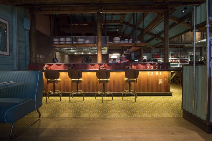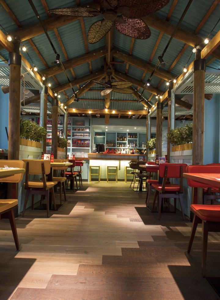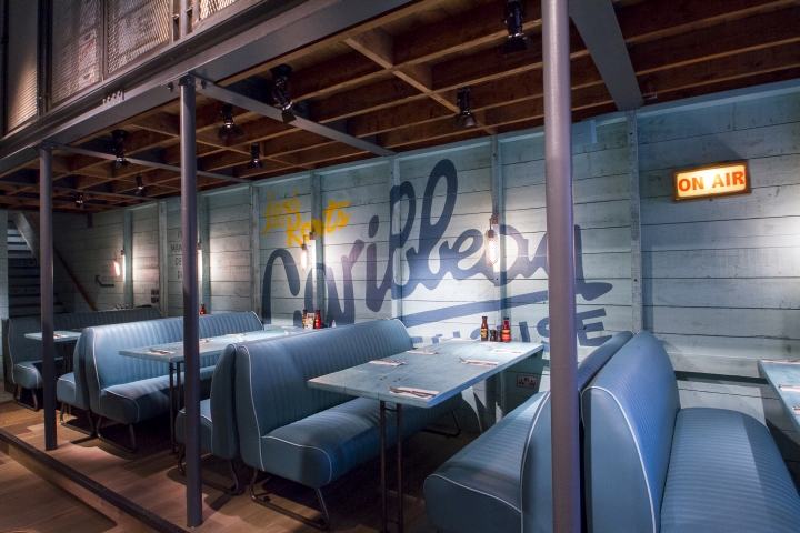 进入餐厅,食客遇到什么看起来像一个凸起的宴会座位区,但真的是一个表演的舞台。在他的音乐的根源,利维希望空间有一个阶段,所以在这个地点灵活设计,B3设计师需要确保汽车座椅是可拆卸复古寻找创造的舞台,是一个特征空间时使用的座椅。这肉是擦着,然后在一个坑里烧了一个木头燃烧的烧烤炉,坚持原来的加勒比海烹饪方法。B3设计者让坑的重点,用瓦楞铁皮屋顶、木结构–老,解构集装箱来源和包覆在坑前,唯一引用的加勒比海的坑。一个缓慢的转折老式风格的风扇是定制的坑地区,提供了一个冷却的厨师水平。它的设计复制的老学校的球迷,他们在加勒比地区使用带驱动器留在保持与原件。
