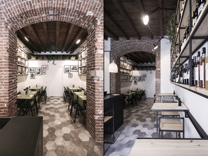 木铁用于家具的主要材料,由鼎帝和西西里工匠实现。地板是铺瓷砖的白色复古砖六角形GRE;柜台后面的墙壁和确保持续提升的黑色铁架子。货架作为一系列可调灯的支撑作用。