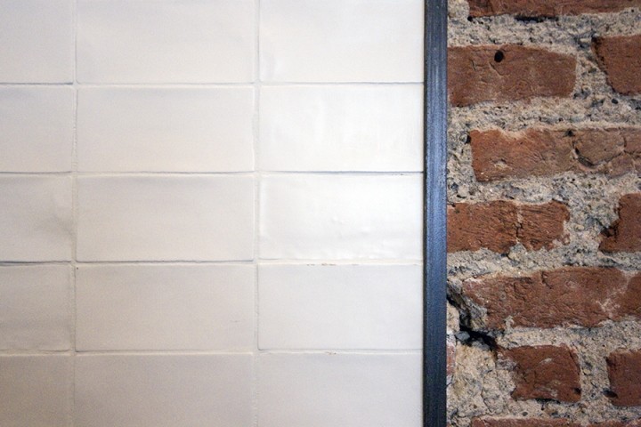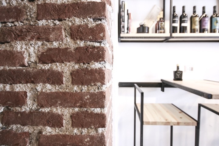 入口是由一个木一个铁栏的柜台,在对面的墙上三个小桌子可以移动到墙上感谢一个滑动系统。高凳子为快餐店提供地方。在整修期间,一个木质天花板已经显现,作为一个裸露的红砖墙,这标志着酒吧区和就餐区之间的通道。