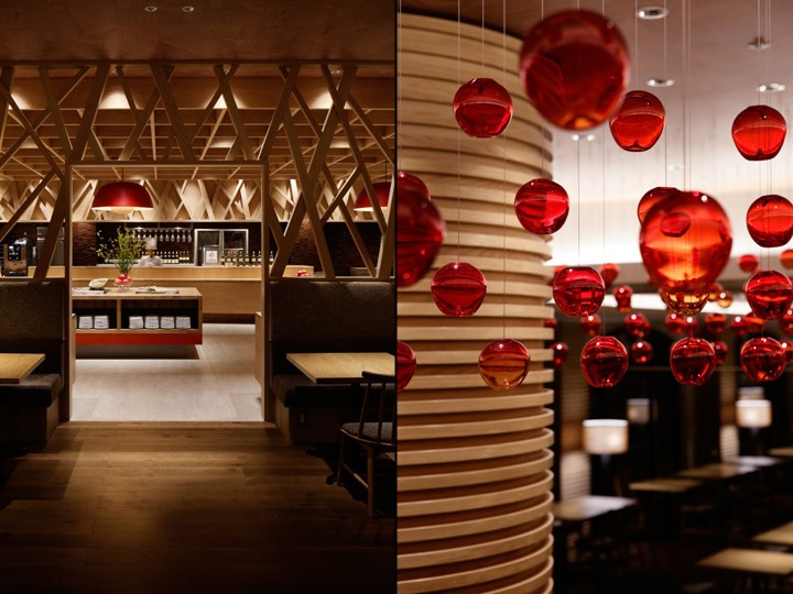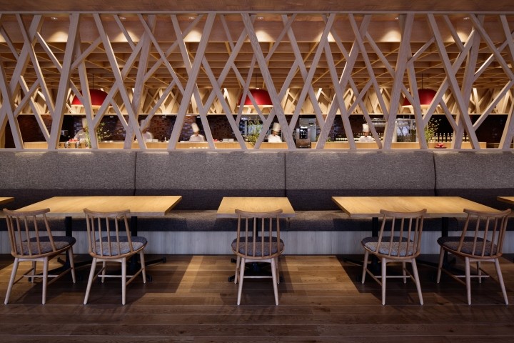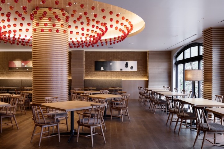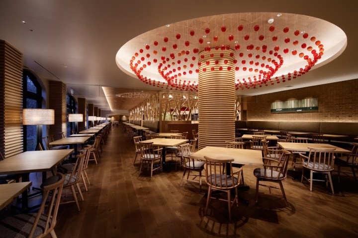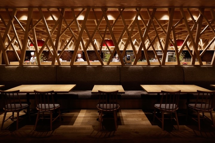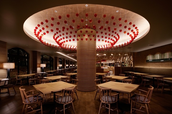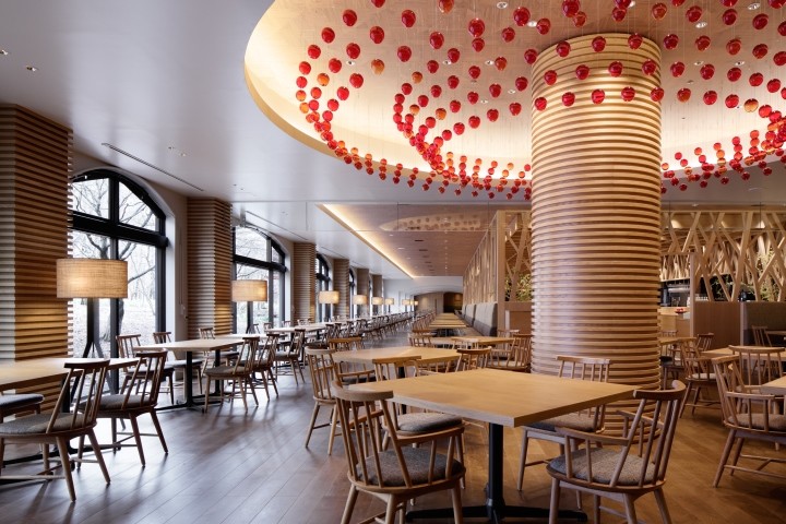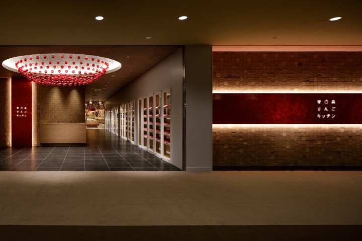 内部使用了大量的木材是在山中的度假小屋的气氛相协调,将元素特征青森无处不在。在小区门口,一个大苹果的地窖,将约1800的苹果和原Cidre,和津轻Vidro(传统玻璃加工在青森)天花板上热烈欢迎客人到餐厅。在自助餐区,巨大的吊灯下bunaco提醒苹果(bunaco是青森传统木工艺品),服务柜台形状曲线像奥入濑慧龙溪,它创造了移动的厨师在空间中的节奏。