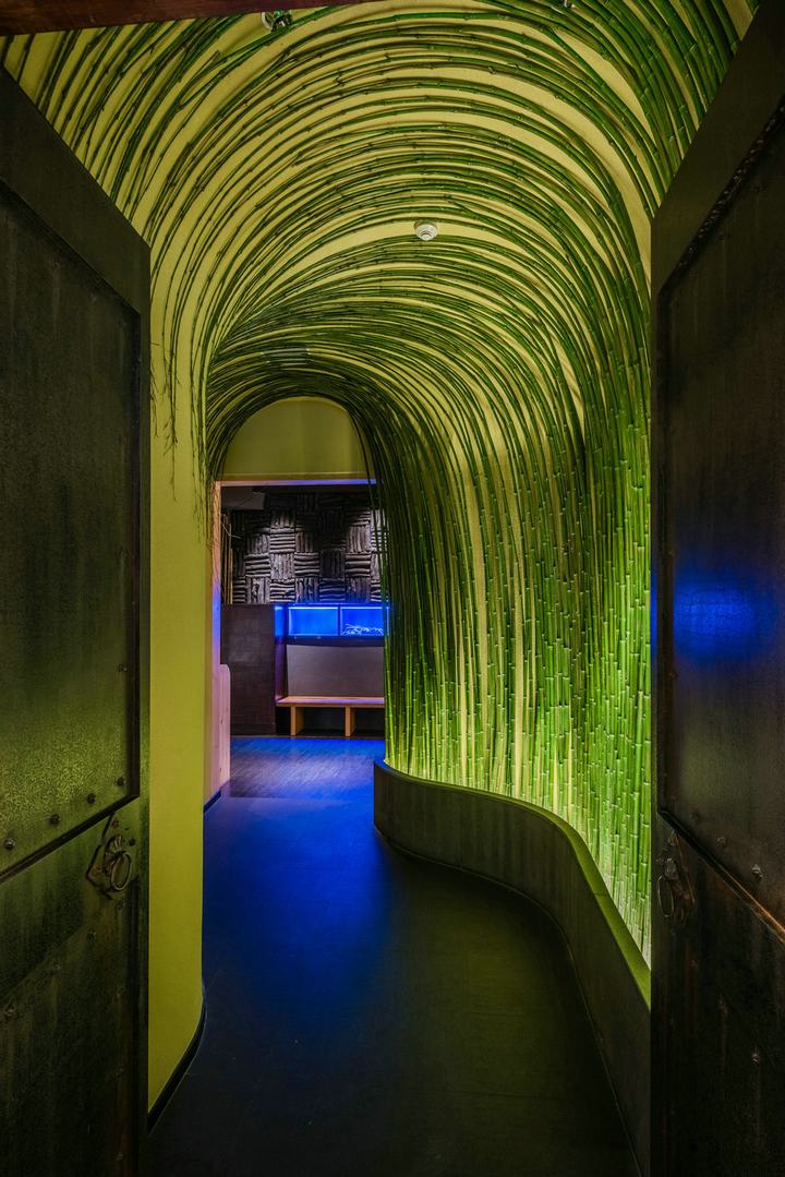 这是位于上海综合商场“陆家嘴IFC国金中心商场”内日本炉边端烧烤餐厅“炉匠炉端烧・酒”的改装计划。庄严的入口及竹拱门走道让客人心中充满期待。店内有2个楼层,1层我们强调原材料的味道,客人会感受到丰富的日本风格。地炉边被吧台围绕,我们计划将其地炉边作为众人注目的舞台。