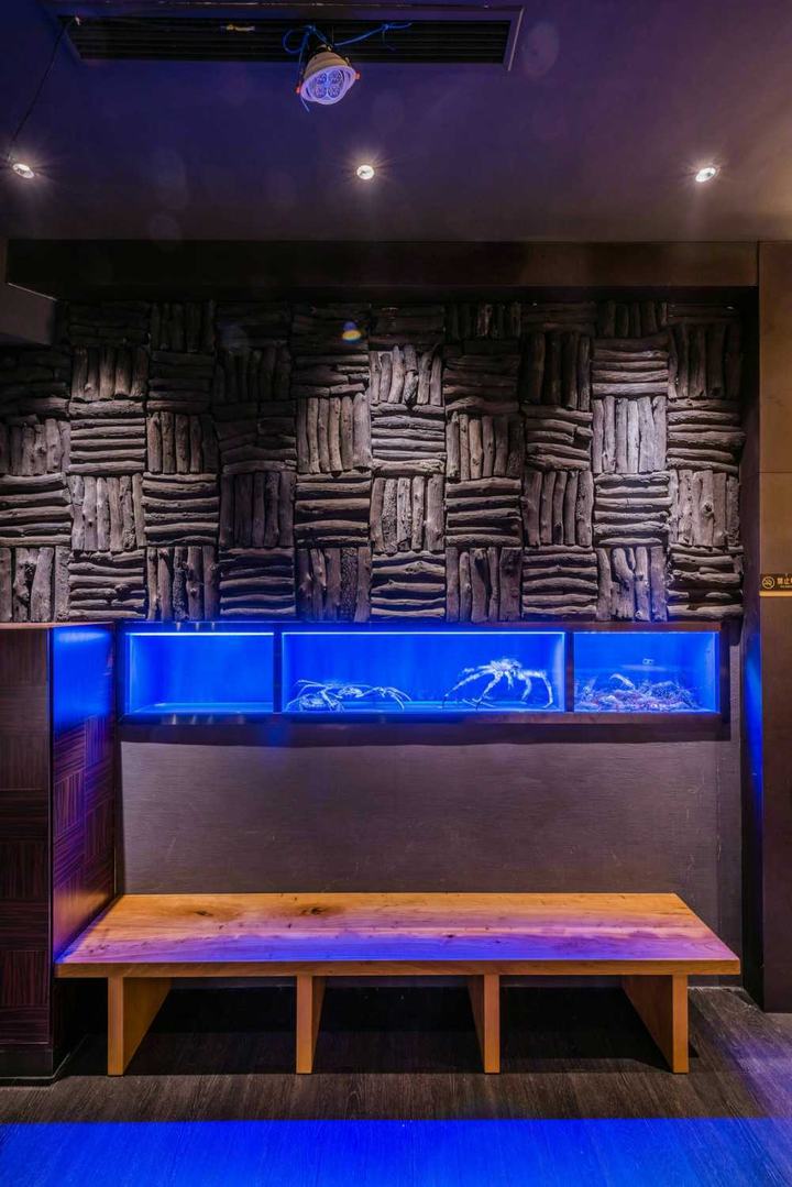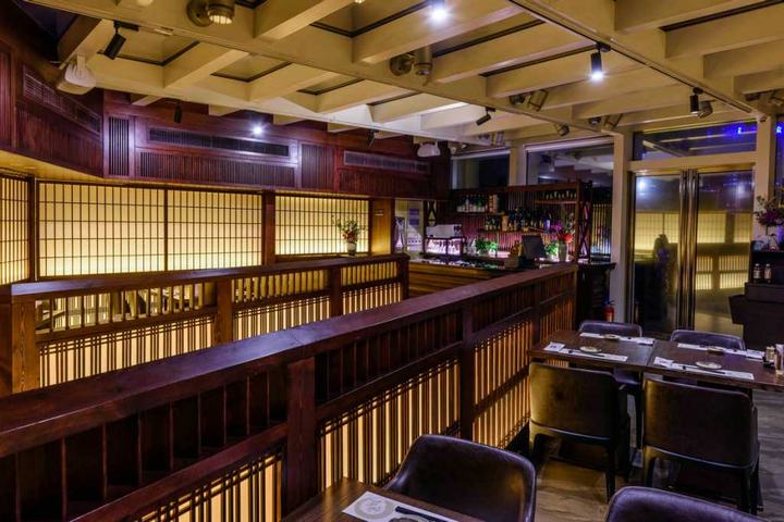 吧台上面设有生气的垂璧,让客人想到熊熊的烈火,地炉的热度和样子展开到整个空间。2层作为宁静及宽裕的空间。1层热闹及2层平静,演出“动”和“静“都具有的空间。我们打造出了客人能感受到地炉边特有情趣的空间—— 兼有热闹及清静。(Shigeru Sato / DESIGN LABEL KNOT)