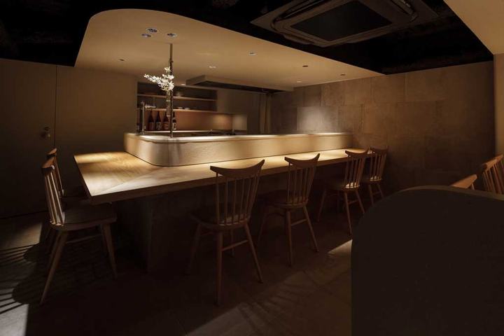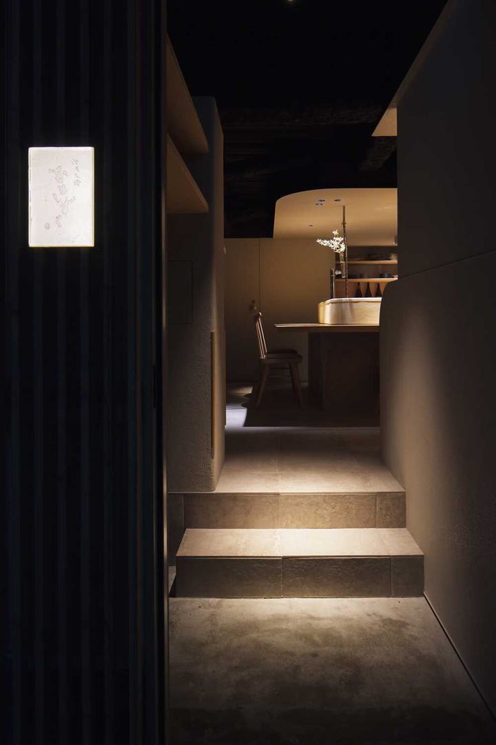 我们采用亲肤的天然材料与考究的色调,以匹配这家餐厅对餐具和盛载的讲究,主要有:泥瓦,瓷砖,木头;此外,吧台角落的金属柱子上还挂着新鲜植物花瓶。如此富有季节感与生气的空间让客人联想起日本传统茶室的柱子、花钉、花瓶的……置身其中,我们都能感受到一股浓烈的日本气息。(小川裕之/小川都市建筑设计事务所)