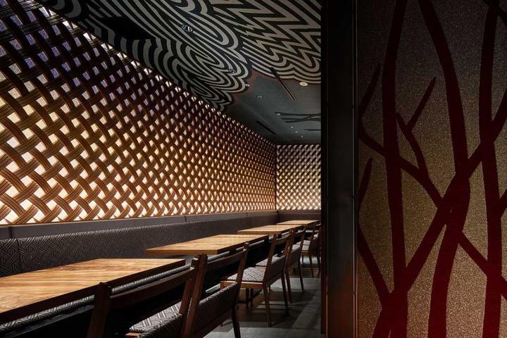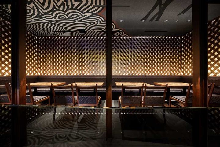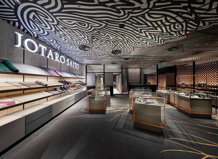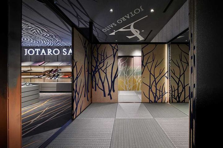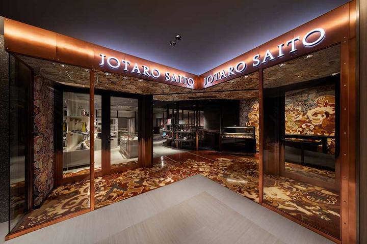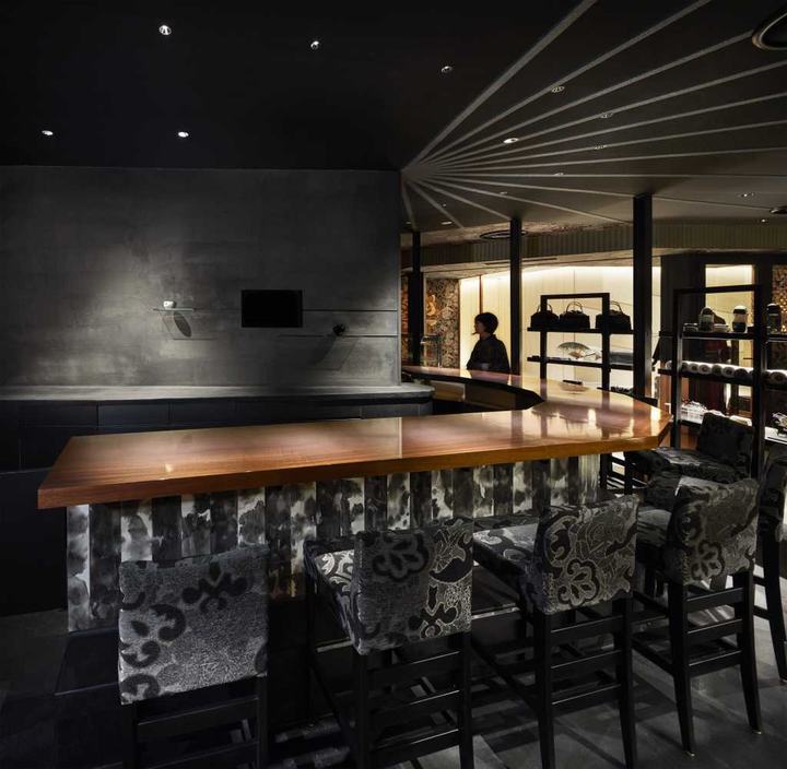 齐藤上太郎是个和服设计家,以“传统才是最新”为主题坚持做衣服。我们这次设计他的新店之际为了表现他的新价值观就用了织物的色彩变化,那些织物是跟他们协作的。店铺门口“铠甲和科幻“为主题,铜色缎子、铬色铆钉以外客人也会看到木材、铁材、黄酮来做的镶嵌。墙面陈列架是把白水泥木丝板随意贴附的,并采用了配套式用具。可变角度架子只有一个扶手,背面的铜色加工给影子温暖的气息。在试穿间摆设了21把隔扇,就有灵活性像江户时代城堡内的走廊一样。独立架子以美术馆的形象为灵感,铜色缎子做的格子和灰色制陶的收存库搭配了,表现细腻且稳重。店内附设咖啡厅,用H型钢材来描绘S的字母,和气地隔开咖啡厅区和购买区。在店里客人不仅看商品,也会休息、买东西,都在同一空间享受。紫色浓淡的柜台带着妖媚的气质,餐桌背后有着银座天空为主题的织物和日本传统踢球游戏为主题的棂,它们体现早晨和傍晚的逆光。为了让客人及和服打扮得更美丽,我们演出了阴影空间。(桶口泰辅 Berlina)