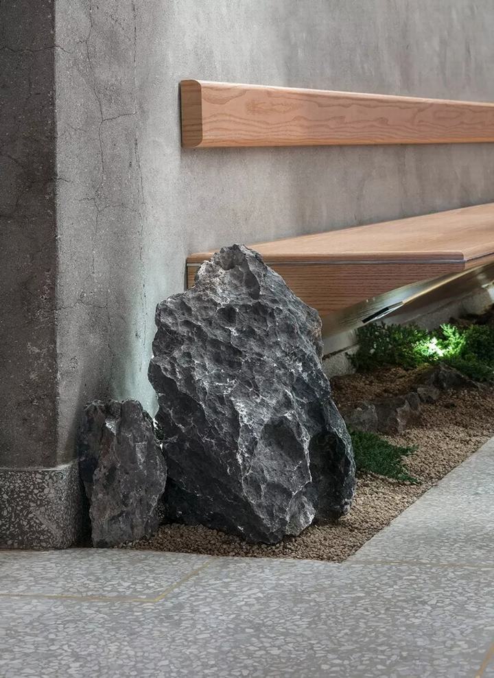 咖啡馆正对面的位置,墙上有木制长凳。室内设计的一个组成部分是精心调整的碎石条上的岩层-分别象征着和谐和海洋-也装饰了外面的门廊。天花板,在一个原始的白色色调和背光,无缝地连接到会场的前段。Oriente咖啡厅的咖啡师提供各种优质的咖啡、茶和其他饮料——请注意,还有啤酒——此外还有不同口味的果冻块糕点。地点:ORIENTE咖啡馆,682-16 Hannam dong(Itaewon)。