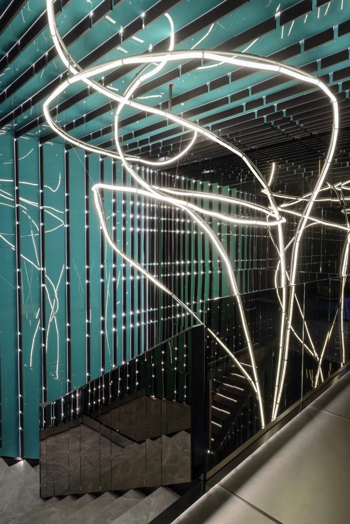 建筑、设计和艺术姿态之间的协同作用,是Maurizio Lai作品的特点,在一个令人愉悦的灯光装置中表现出来。一根流动而爬升的光弦连接了空间,形成了一个三维的标志,引入了动感和垂直的主题,主导了大厅,一直延伸到二楼。背景是翠绿色的玻璃墙,垂直扫描生动的斑点。古铜色镜子的深层表面涂满了楼梯井的墙壁,无限地反映了这个装置,扩大了空间和视野。