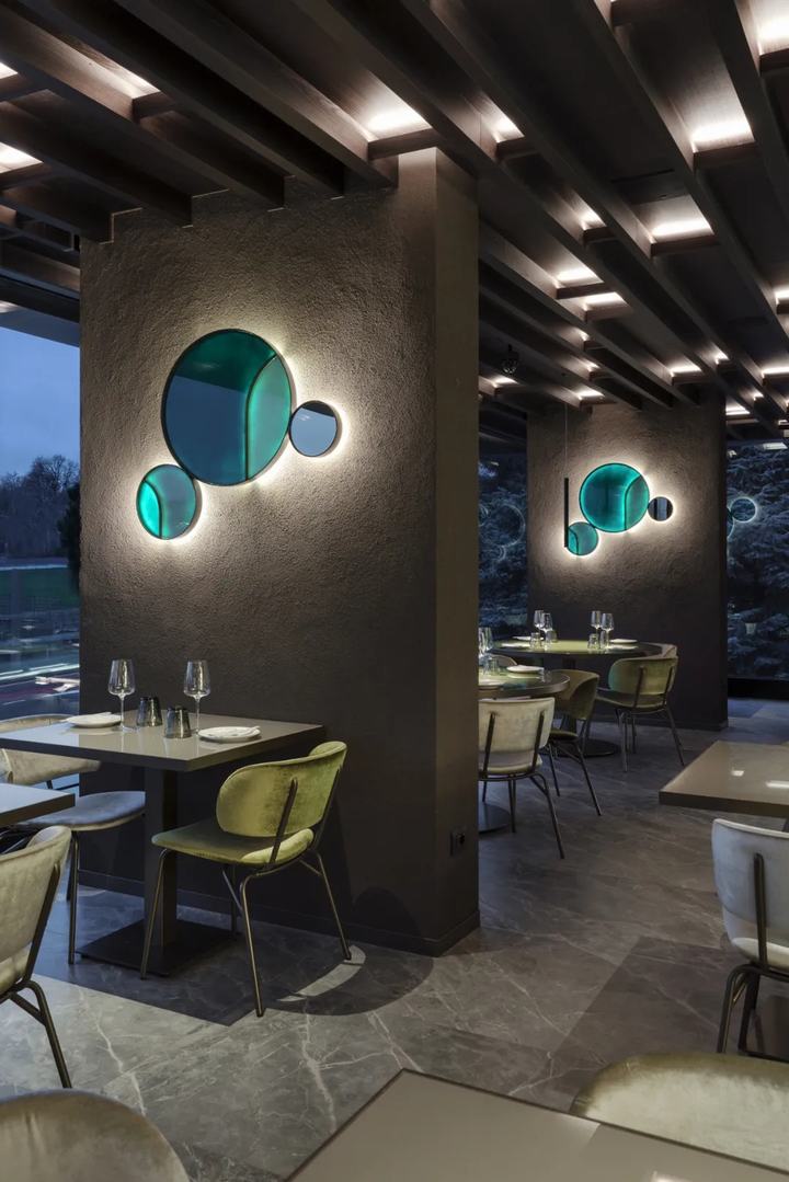 宽敞的主餐厅由第二个装置装饰。对背光聚碳酸酯板上的数字打印进行有序扫描,绘制出一幅本质上是水生景观的画面,色调与墙壁上的调色相邻,但与房间温暖的木质镶板形成对比。横向雕塑沿着侧壁与设计项目交流,在那里一系列定制的灯在彩色玻璃上绘制出永恒的北极光的感觉。从这第一个标志衍生出来的其他背涂玻璃发光配件在连通的房间里随处可见,它们的存在自然地伴随着客人的目光。