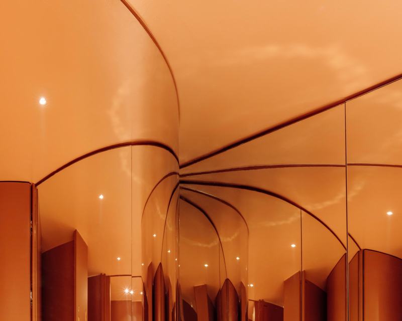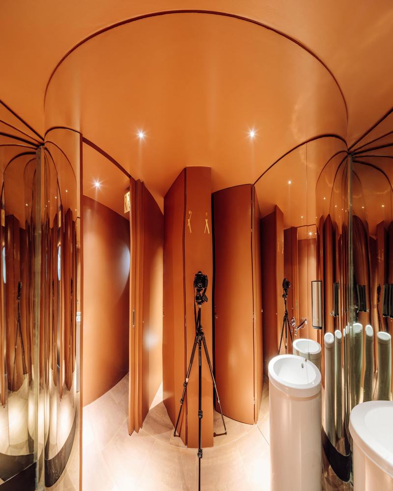 餐厅的入口和酒吧占据了第一个主要空间,吸引游客通过隧道进入,露出柔和的柔和光线,模拟了夏日夜晚的氛围。隧道通向鸡尾酒吧和螺旋楼梯,每个楼梯和楼梯均由定制的金属结构建造,楼梯将游客引向较低的就餐楼层。