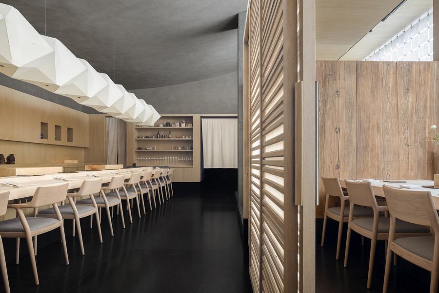 一种传统的中国建筑材料,夯土,被用来覆盖前面区域的展示表面。此外,在用餐区使用了水磨石、木材、纸张等各种廉价的天然材料,给用餐者带来了极好的审美体验和人文关怀。