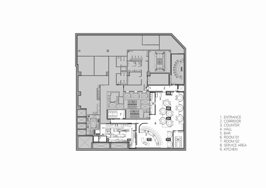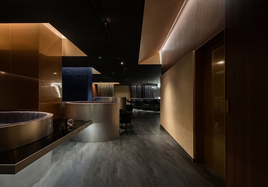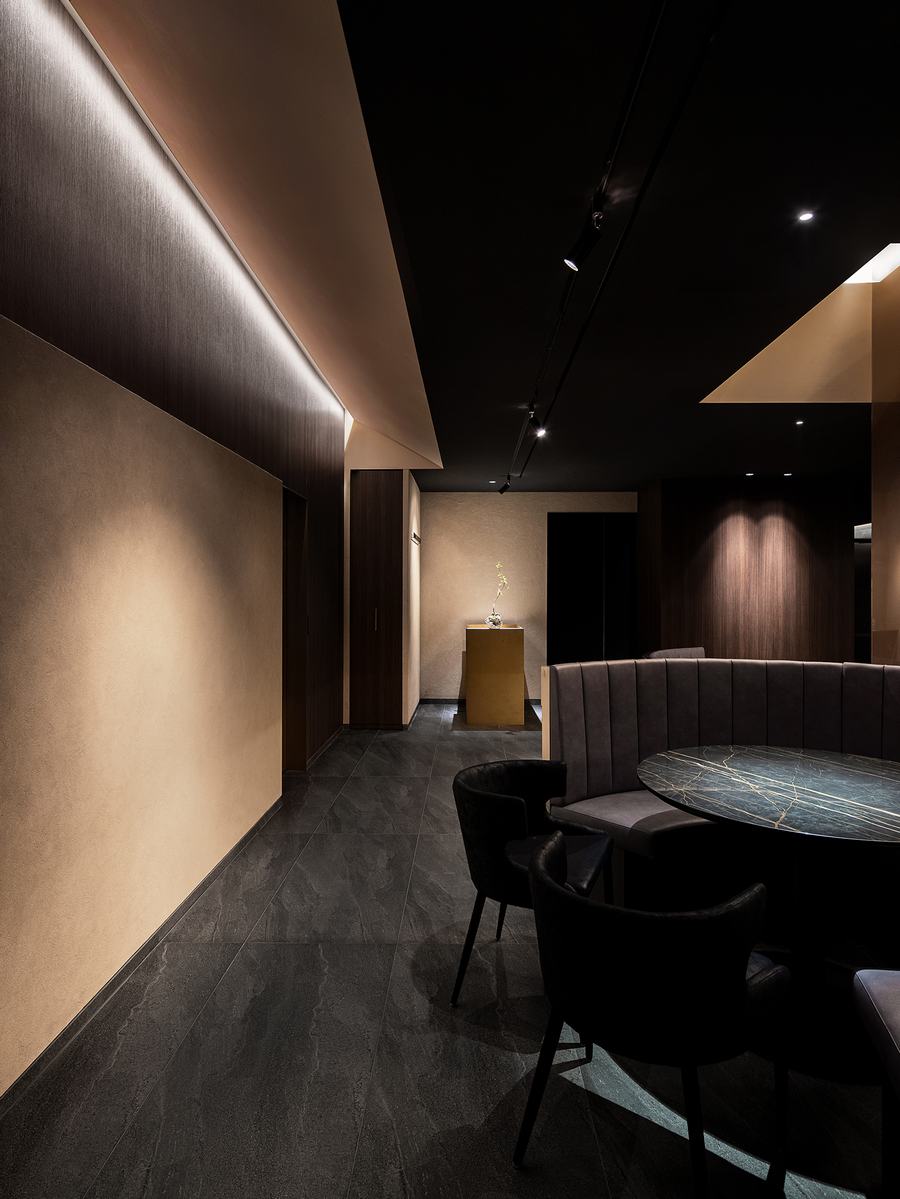 380平方米的Kappo Akii由大门、走廊、大厅、吧台、房间、厨房和服务区组成。每个空间都有一个新的场景,即使是在一个空间中,也通过专门的设计来表达不同的空间感。穿过大门后出现的狭长走廊的地板图案和三面重复的线条照明,突出了作为进入大厅的过渡空间的沉浸感。