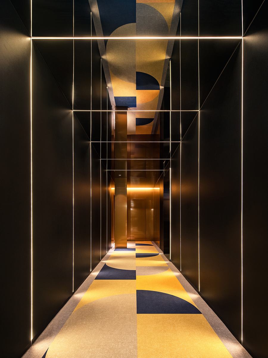 在服务区体量和房间体量中,木材和米色纹理绘画混合搭配,表达材料带来的温暖,平衡整个空间。天花板是暗色的。此外,柱子和斜向墙、房间以及与服务区墙壁接触的天花板都被挖成斜线,发出温暖的光,突出并表达不同材料的感觉。