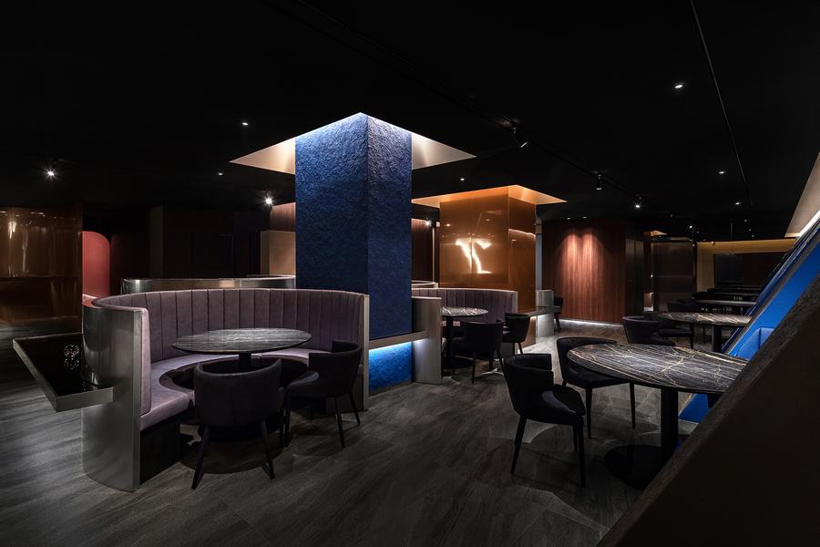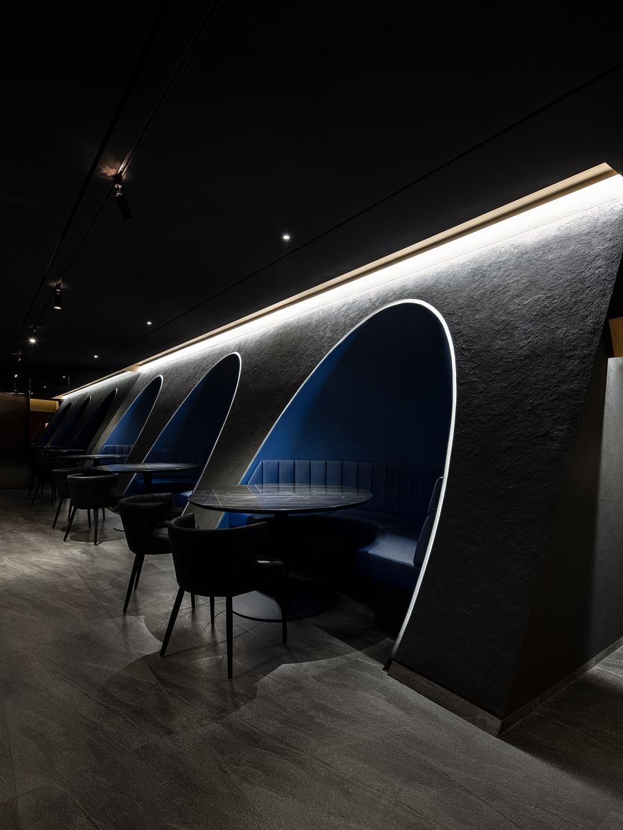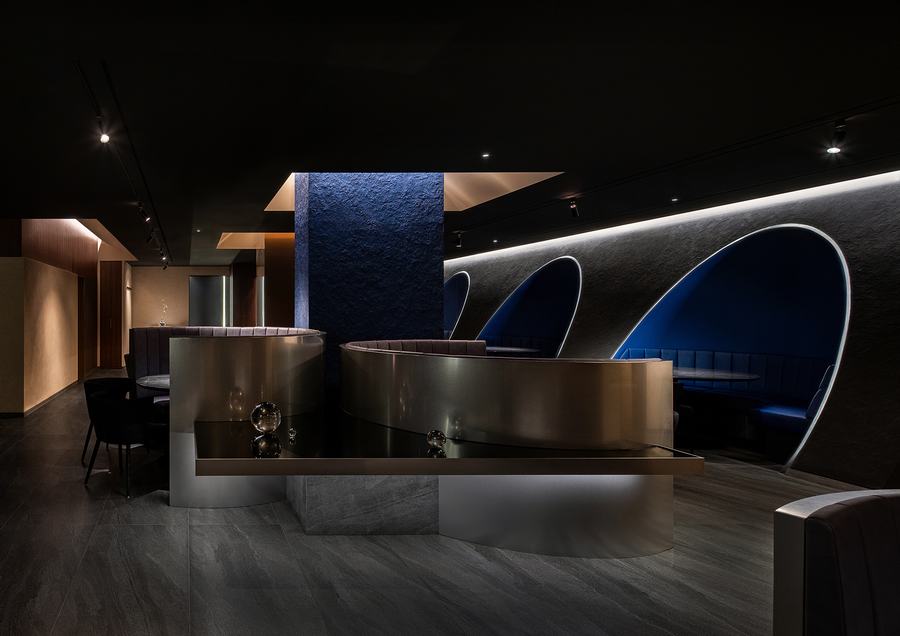 圆形宴会厅的座椅穿插在大厅的对角线上,为空间增添了丰富性。对角线的墙壁用黑色质感油漆完成,但座位所在的空间与柔和的海军蓝形成对比,让用餐的顾客感到舒适。