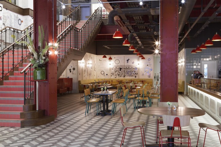 餐厅大厅用干植物装饰。我们保留了一些建于ХХ世纪初的典型阁楼空间,铸铁柱子和建筑原有的梁。由钢筋制成的高屏幕也让人联想到纽约工业繁荣的时代。