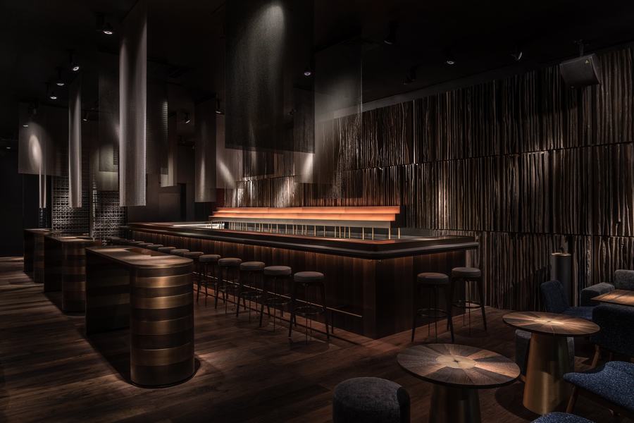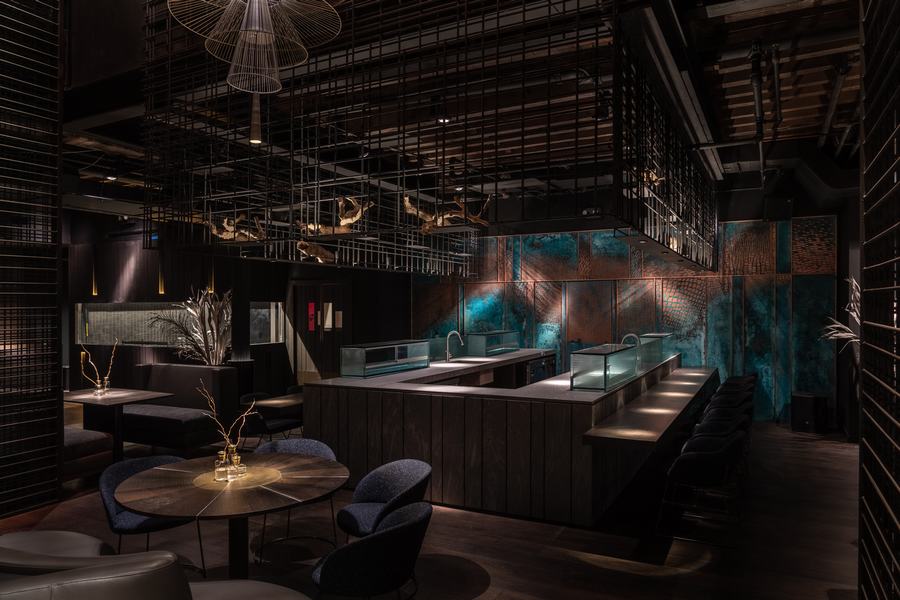 室内的灰色、棕色、蓝色混合了现代设计和建筑的原始氛围。我们通过室内细节来表达轮回的主题。我们使用了800-4000年历史的木材,根据专业知识制作桌面和部分墙面。