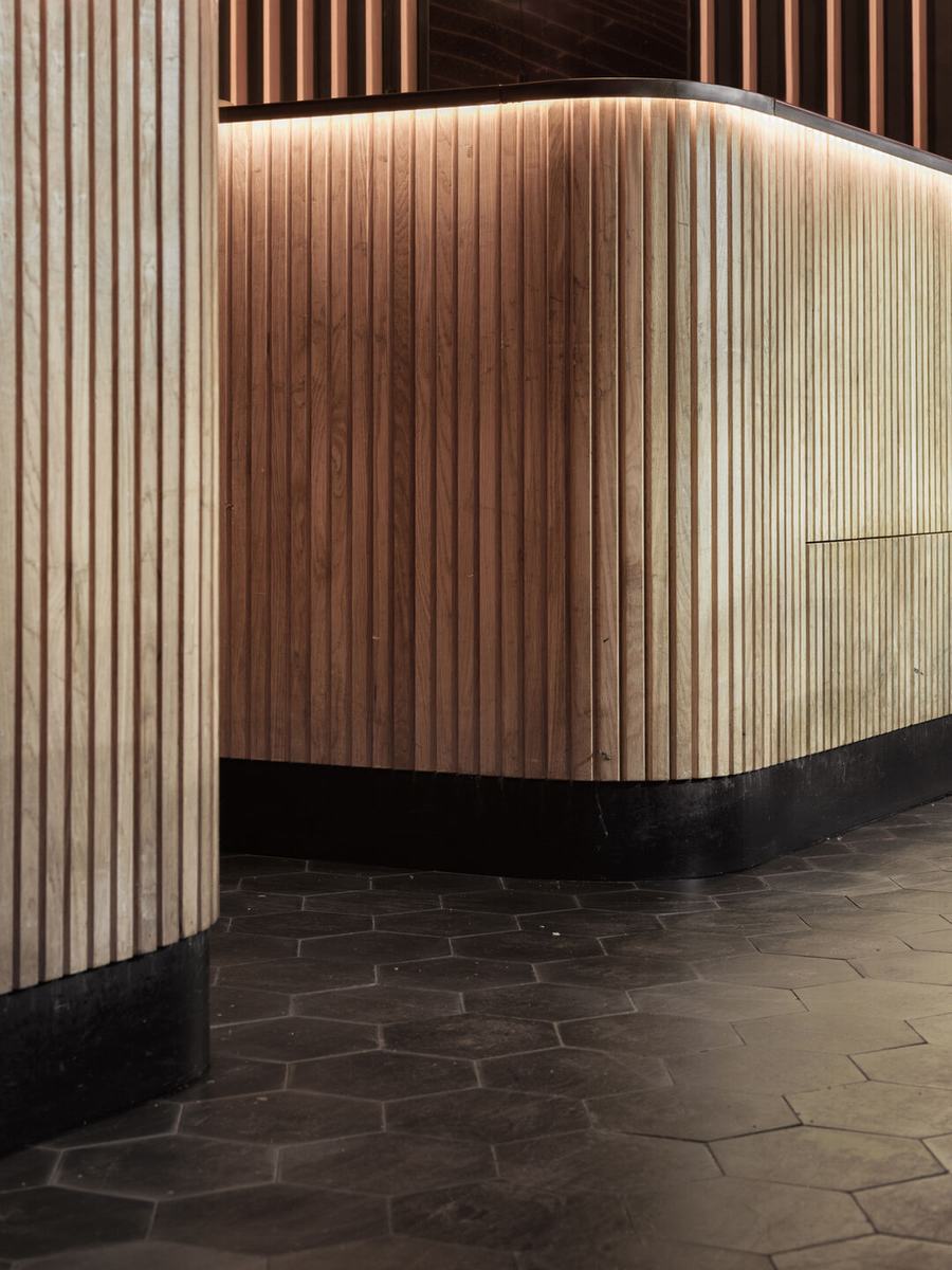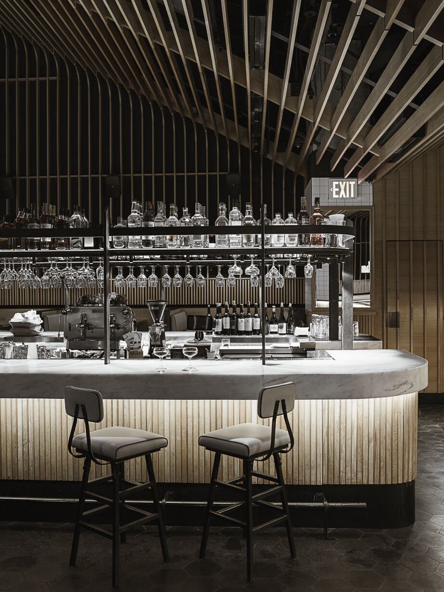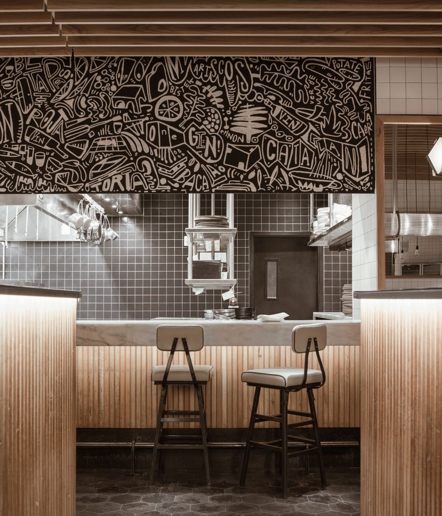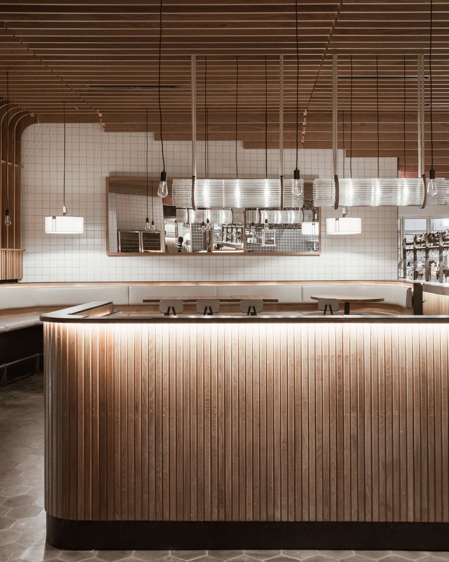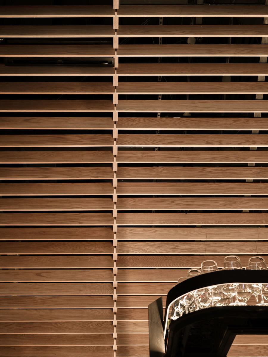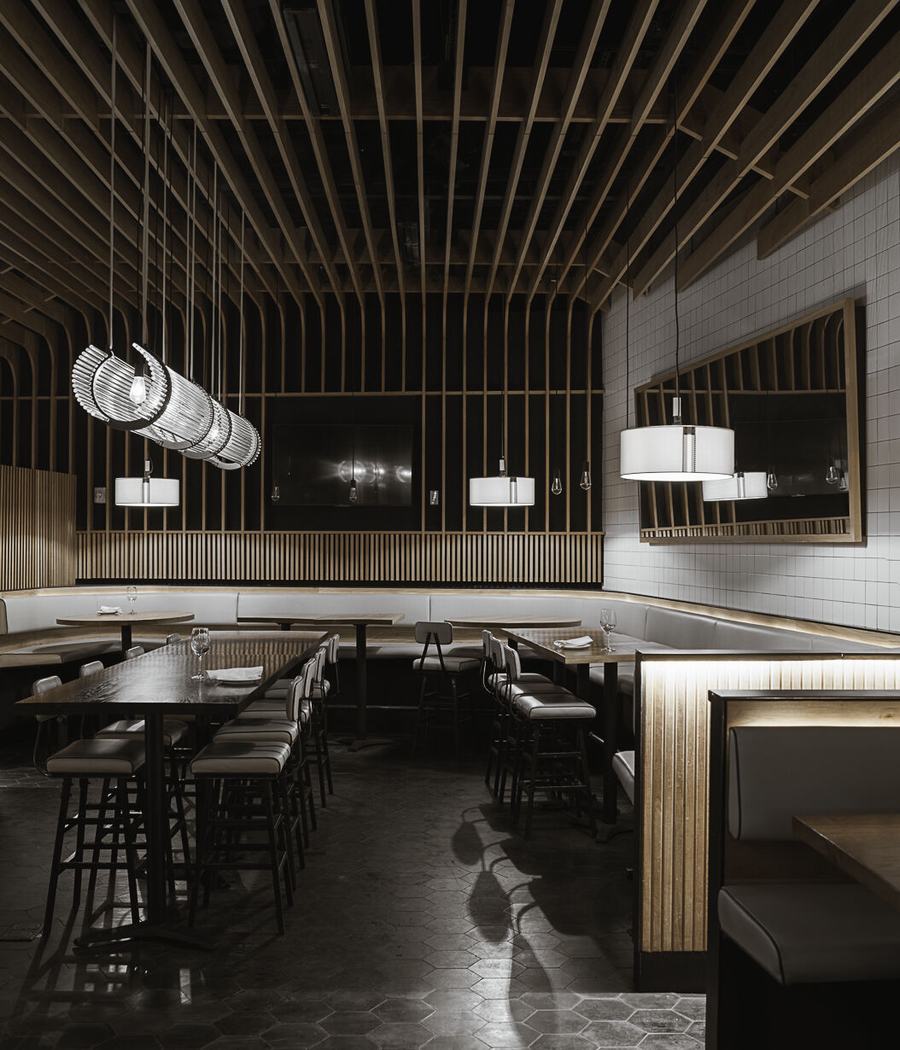 一个包罗万象的天花板欢迎餐厅的顾客,并定义了一个具有特定品质的空间:温暖和规模。一系列木框架横跨餐厅的整个宽度,创造了一个独特的视角,从第 40 街通过高大的玻璃幕墙可以看到。