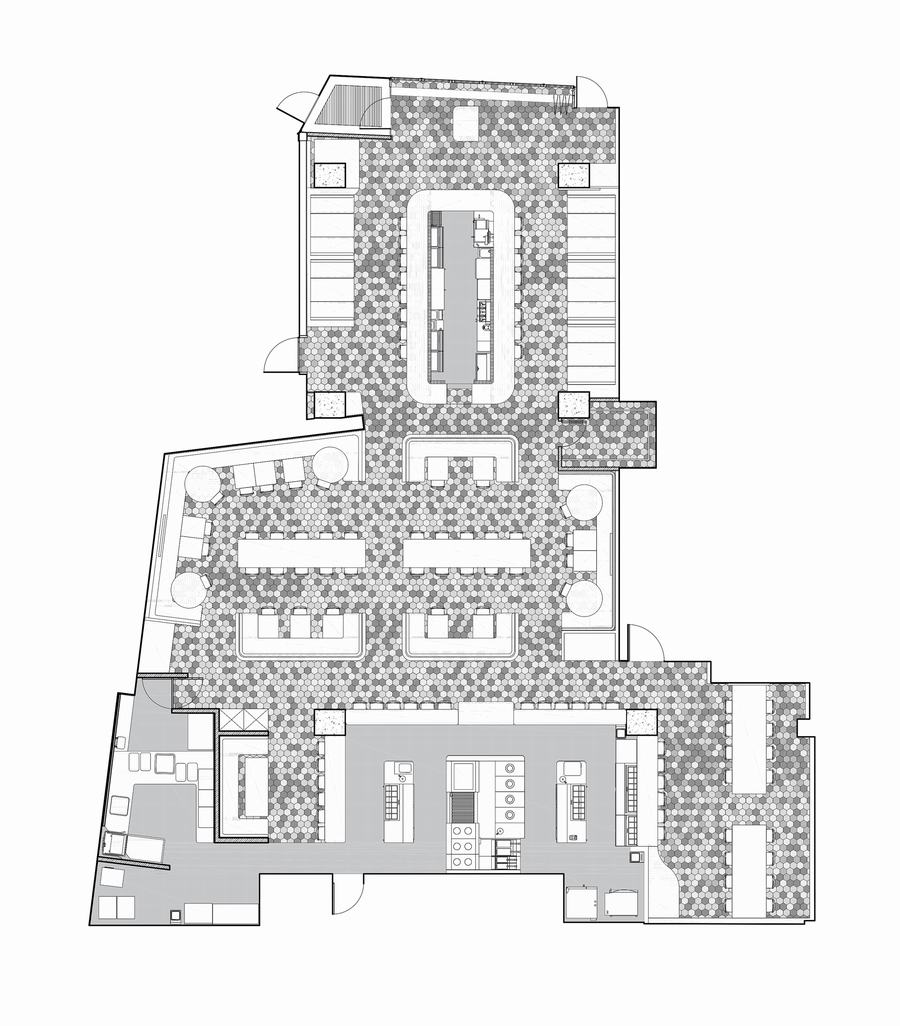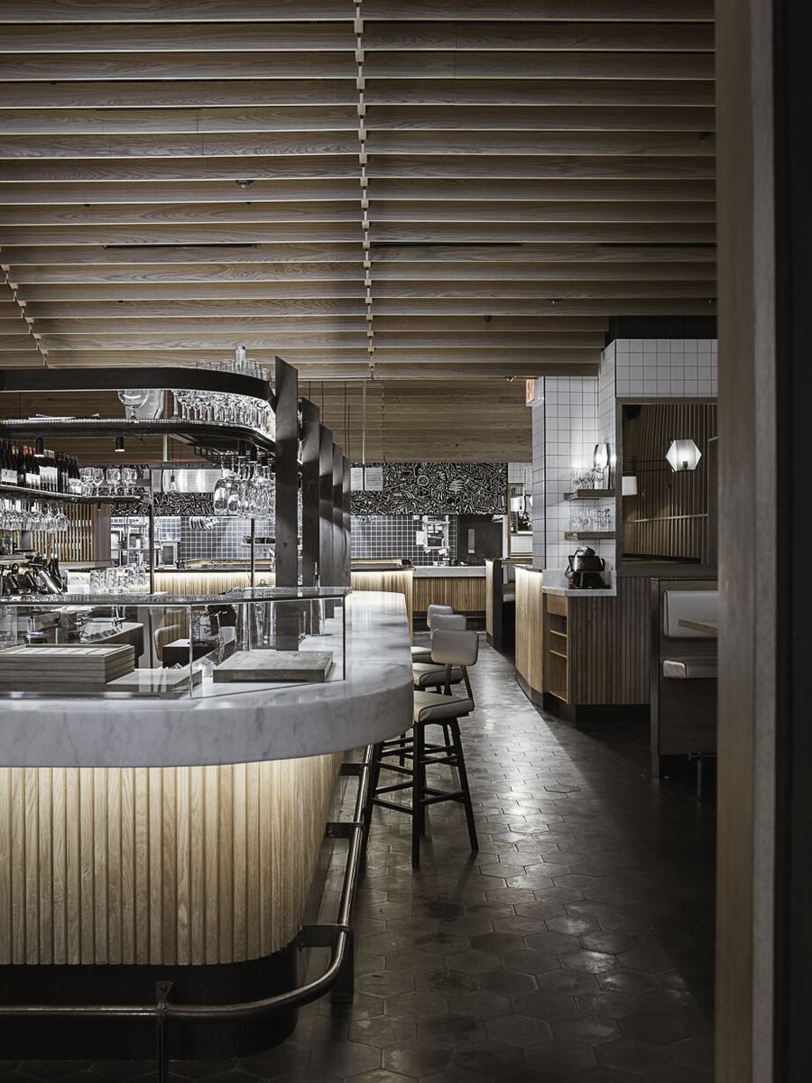 框架遵循建筑轮廓将所有部分编织在一起,并提供高高的天花板和更私密的区域。大理石台面、水泥瓷砖地板和木制家具完善了材料选择,并有助于创造一个与现有“Boqueria”身份相连的空间,并提供定制设计的体验。