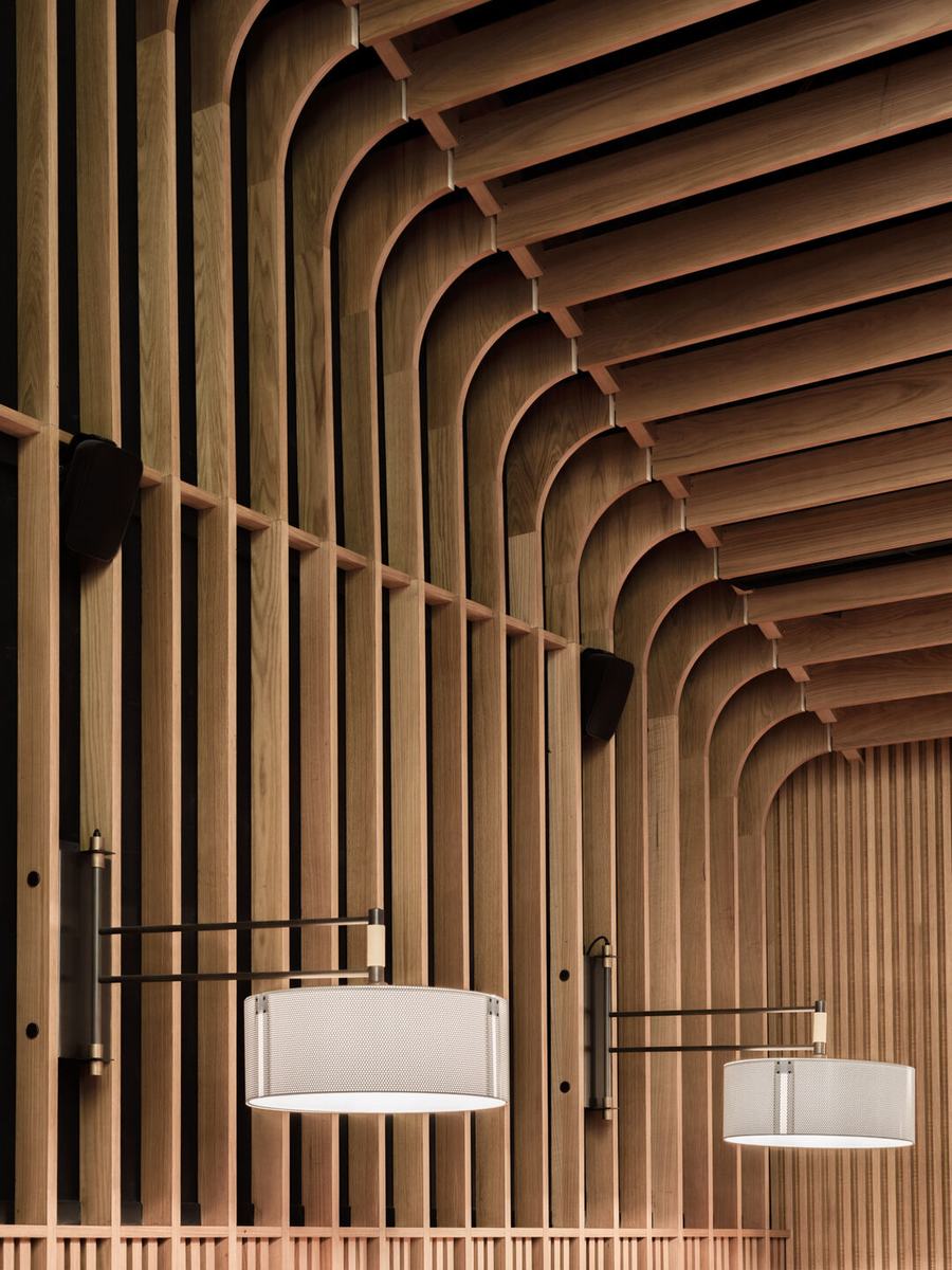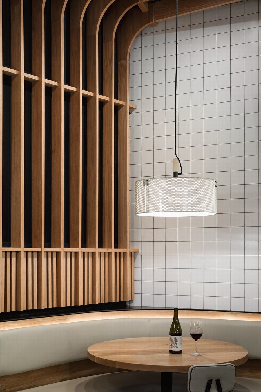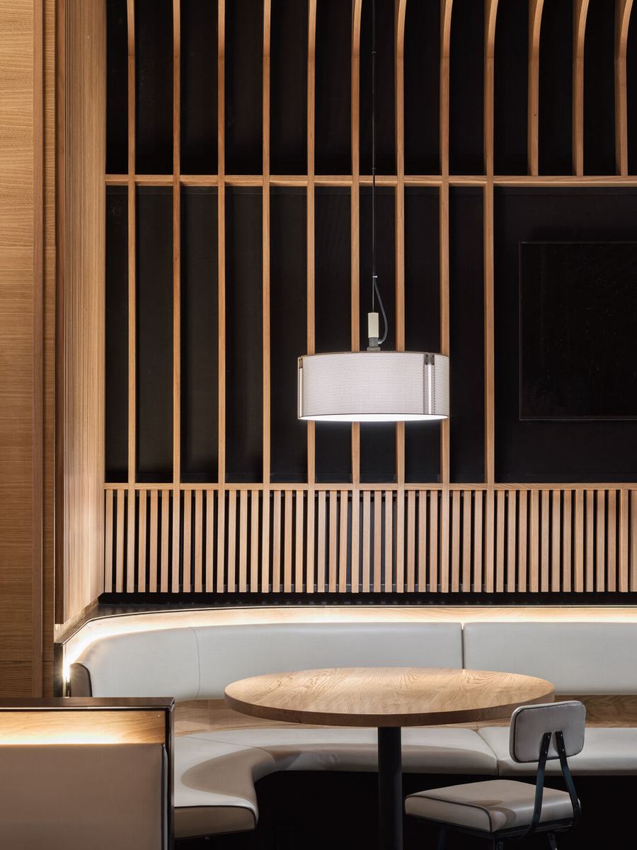 餐厅空间占地440 平方米,对于设计师来说,这是一个具有挑战的空间,木框架的顶部和墙面,给空间带来一种包裹的感觉,整个空间在暖色的色调下,显得非常舒适。
