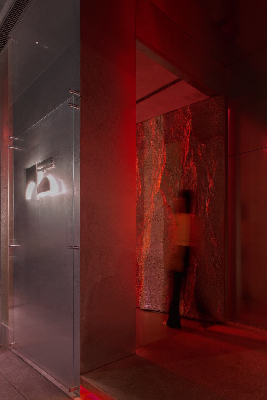 基于以上概念,MASS Lobby和minors Lounge具有鲜明的设计特色,而Leap Tunnel是一个商业功能较少的中间走廊,被标榜为艺术中心。MASS Lobby是一个向太空时代的东欧建筑致敬的最小的盒子结构区域。相比之下,未成年休息室呈现了一个经典的年龄场景,编织混合的原创作品和标志性设计的改编。为了连接新旧世界,l形隧道被分为两部分——灵感来自Olafur Eliasson的艺术作品“接触”的石墙走廊和类似太空舱外观的时钟隧道。