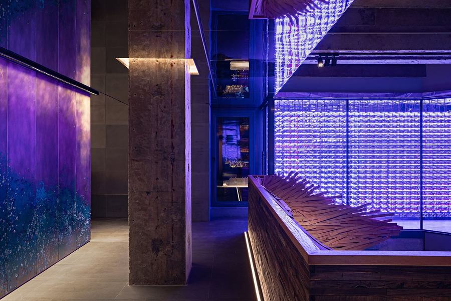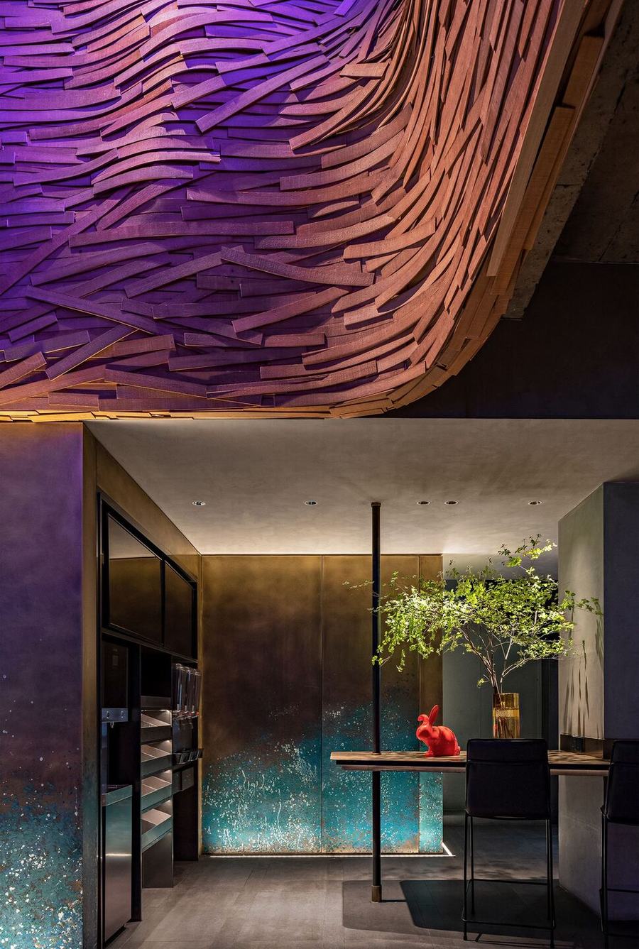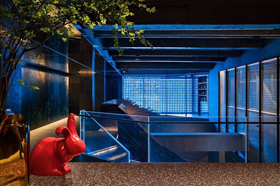 在蓝紫色的灯光渲染下,沿着楼梯上楼,仿佛在仙境中走过一条迷人的通道,在这里,粗犷原始的自然释放出活力。