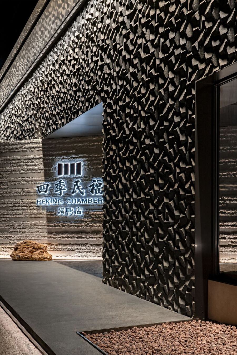 食客需要沿着狭窄的道路向军南巷西走一点才能到达入口。原本的餐厅门虽然很大,但缺乏寻找新希望曙光的乐趣,朝南的开口使其显得不显眼。因此,设计师将门头改为窄门,向南旋转一定角度,让所有进入胡同的车流和人都被门头吸引。暗石的大胆运用,让规则的建筑结构更加强大。穿过窄门进入,是一次暂时远离城市的远征。