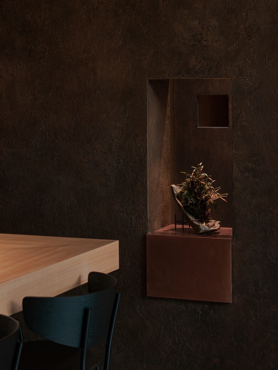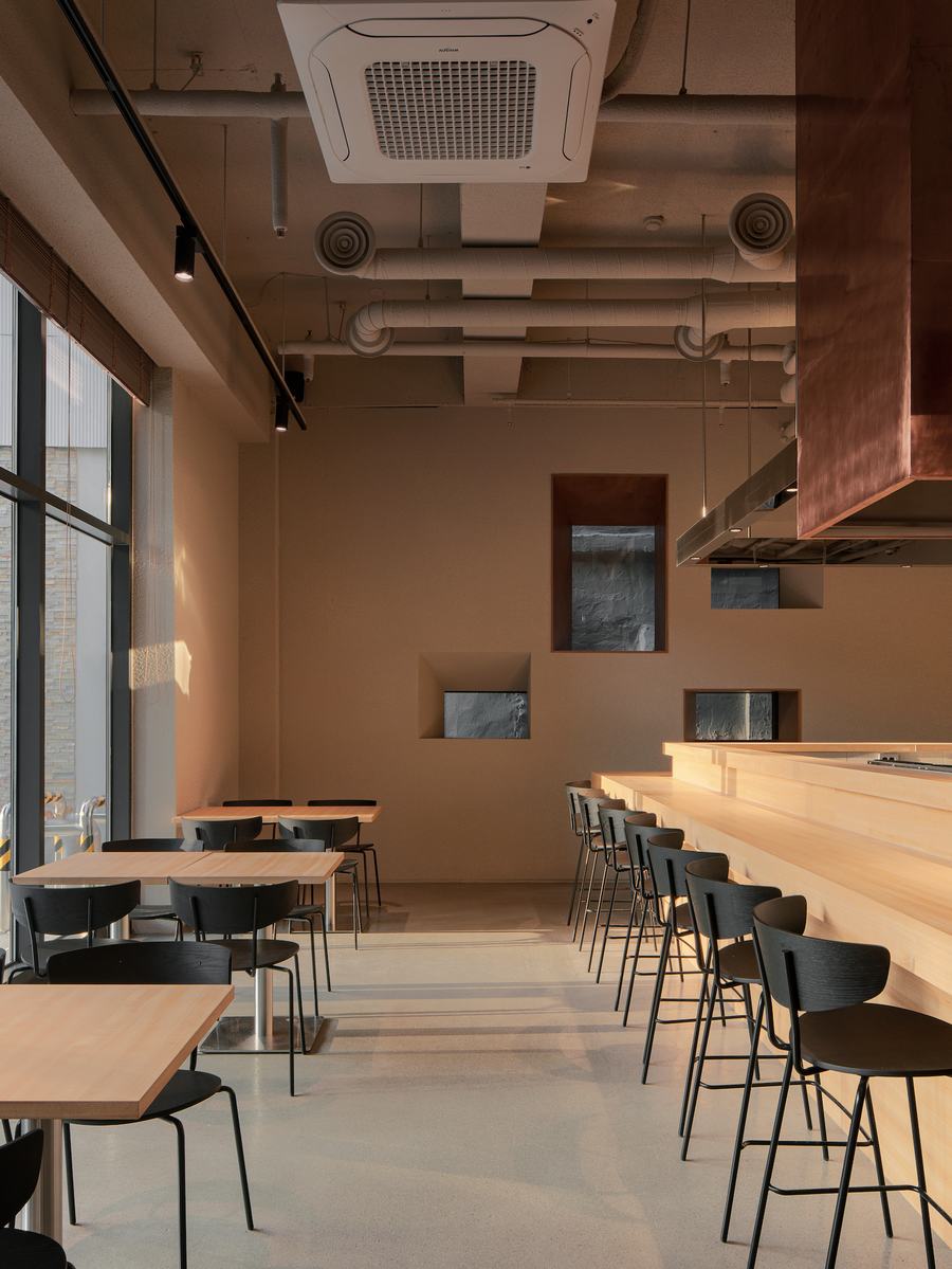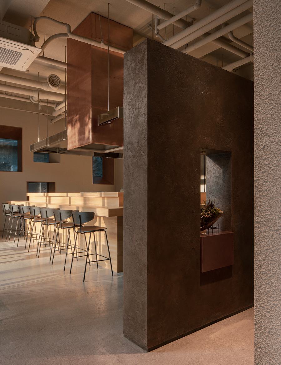 对面的五个窗户通过蒙太奇方法放置在它们原来的框架上。实践设计它使窗户外的墙壁的纹理根据每小时变化的阳光而变化。为发挥功能而放置的中央吧台的引擎盖用日本餐具中常见的紫铜包裹,用作支撑空间重量的物体。为了强调这块沉重的红铜块的重量,他们在每一边插入了镜面SUS的狭缝灯条。