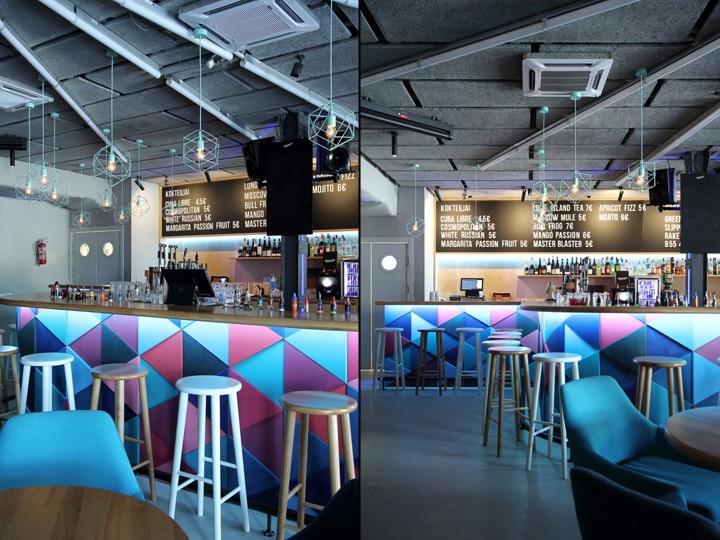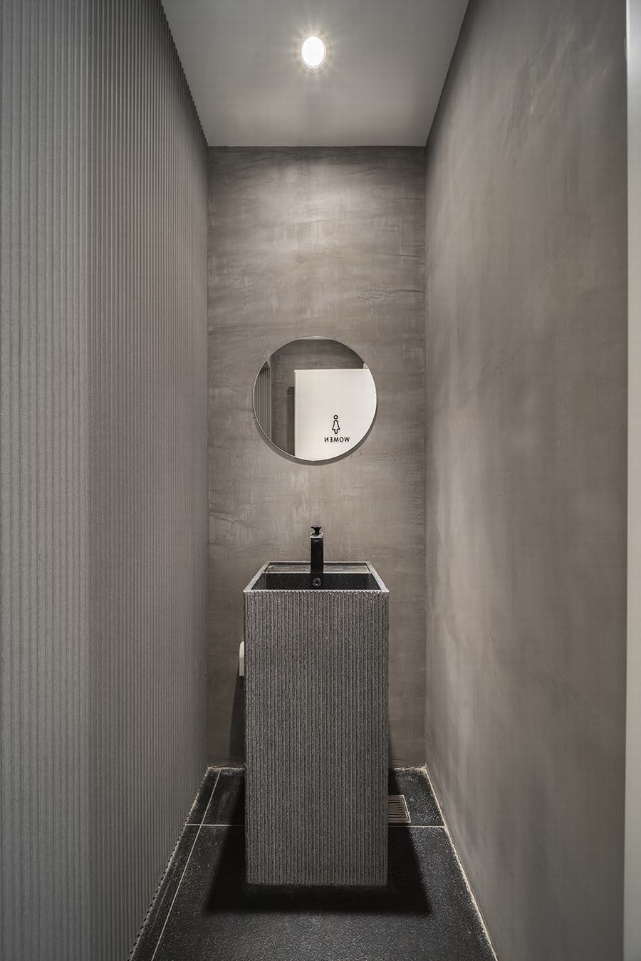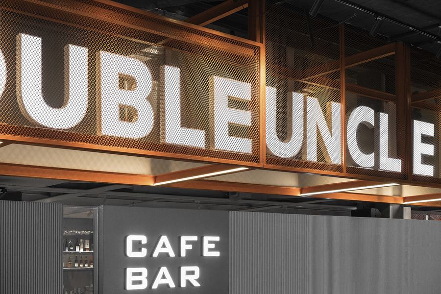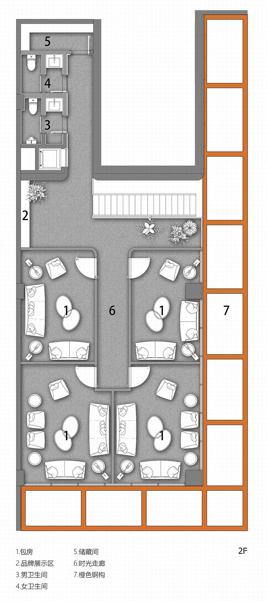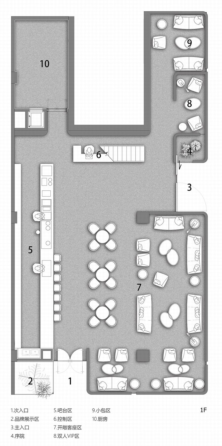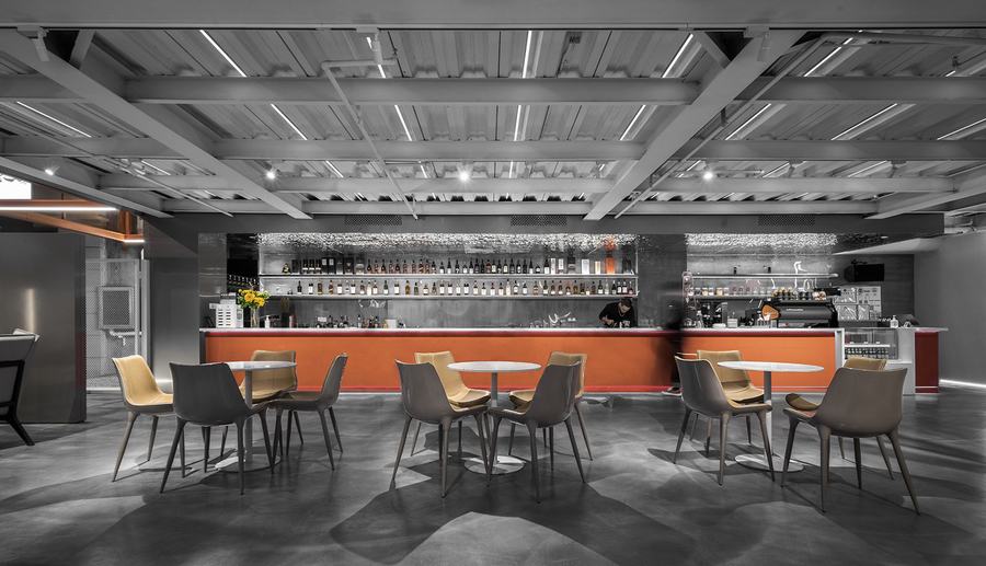 店铺整体经营模式采用白天咖啡,夜晚红酒的经营理念。沿一层西墙设置11米长的主酒吧区,集咖啡、混合饮品、精酿啤酒、盛装、产品展示等功能于一体。所有生产线集中在吧台区,北侧靠近厨房入口,方便物流人员提货和配送。楼梯下设置“设备栏”,将所有弱电控制设备隐藏在此,便于调试和操作,成为“橙色线”的一部分。