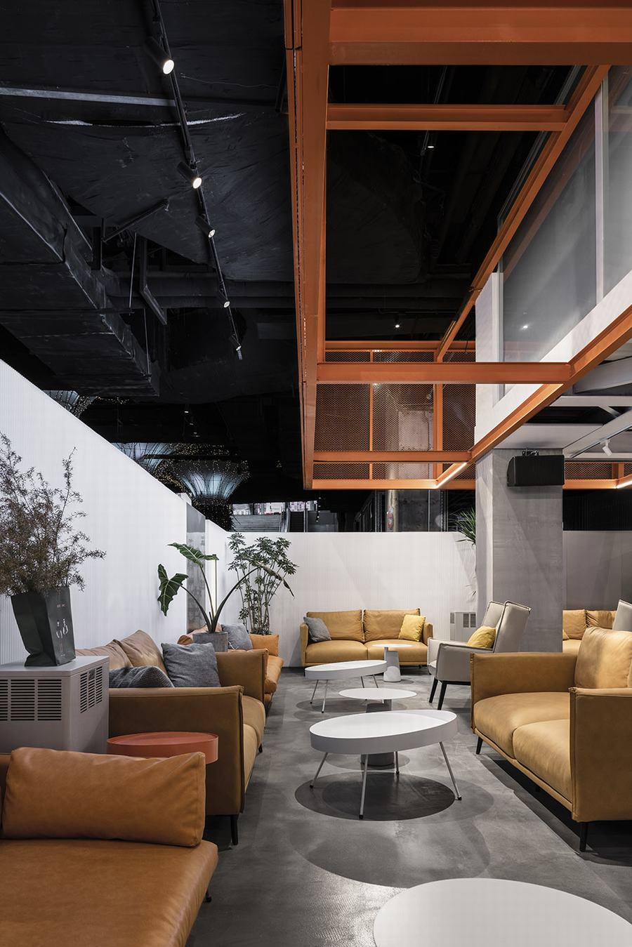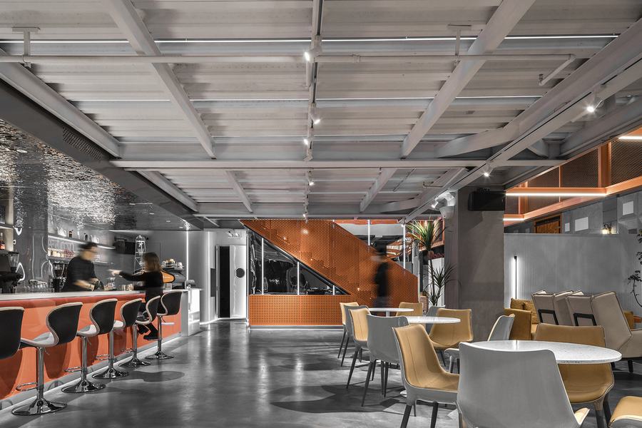 场地内有原业主搭设的二级钢结构楼板。作为限制,一楼和二楼的层高不能调整。为了让新业主未来的营业面积最大化,在原有二层结构的基础上增加了新的钢结构框架,作为后续区域扩展的结构储备,同时不破坏一楼原有的开放空间 .