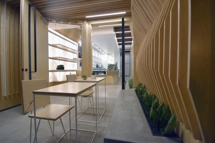 从入口你可以看到酒吧,你也可以发现反射体,隐藏了卫生间、储物柜和其他一些私人空间。空间与外部协调,有两个大窗户,在折叠系统中打开,以邀请街道进入其内部。在我们的设计中,我们倾向于首先关注环境、内部和外部,然后关注人的互动,以及空间如何被感知或被利用,从座位到人的互动。这就是Laboratorio的做法。