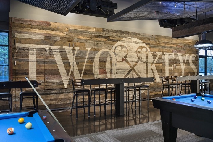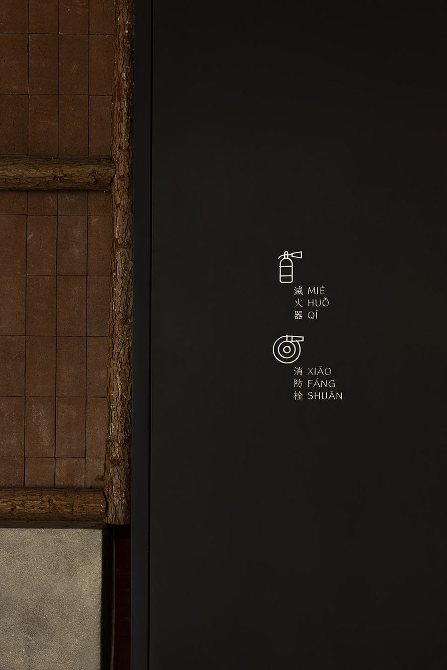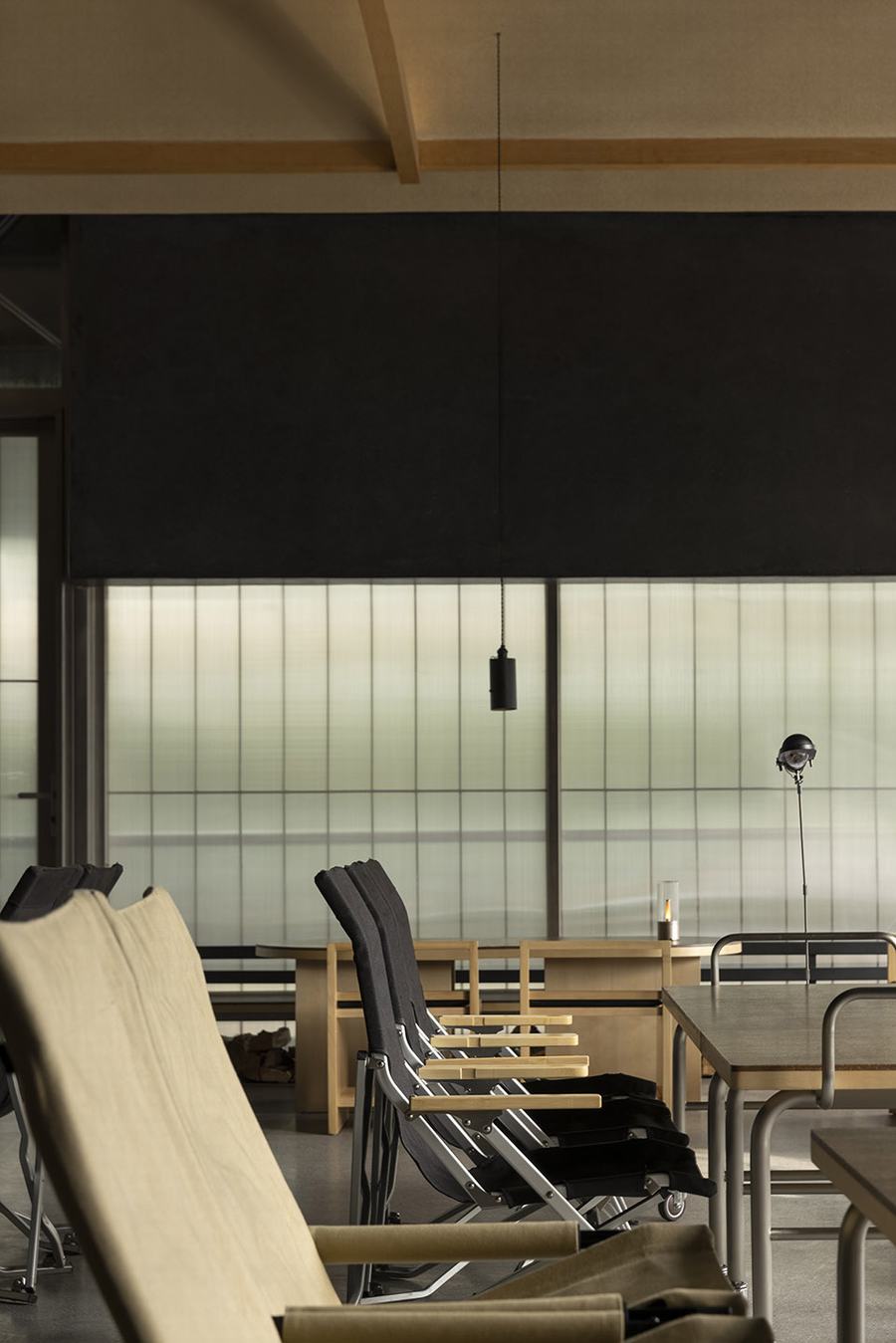 透过走廊隐约可以看到,私人房间的斜木梁天花板形成的屋顶角度将这个空间分隔成单独的空间,清楚地告知人们这是一个可以进行私人活动的区域。