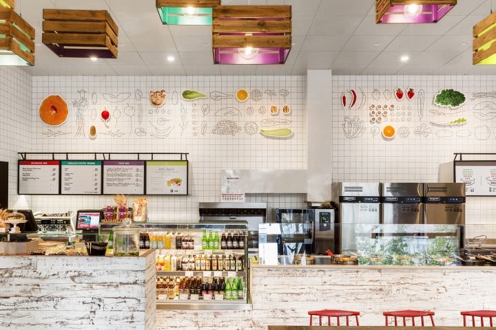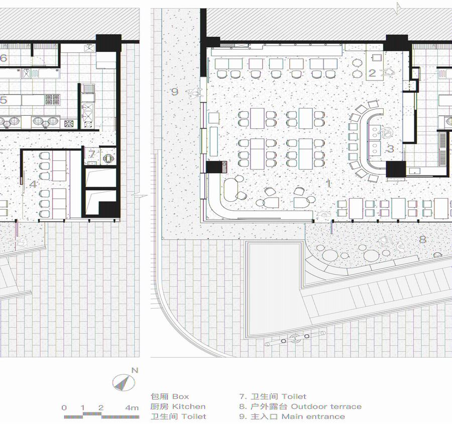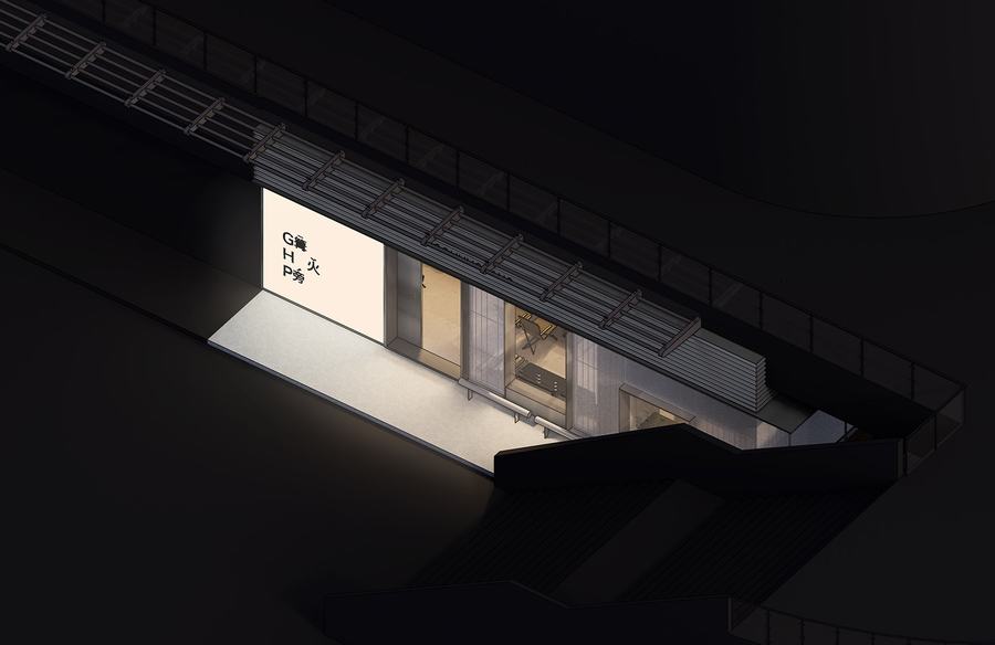 用于两个商店,正面和角落的侧面被改造,保留了2/3的侧立面玻璃来展示半透明的表面。这样的表面加上内部局部区域的透明窗户,使灯光和烧烤场景成为商店立面的主要画面。