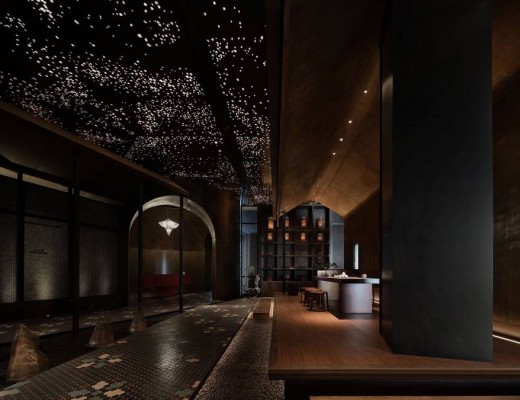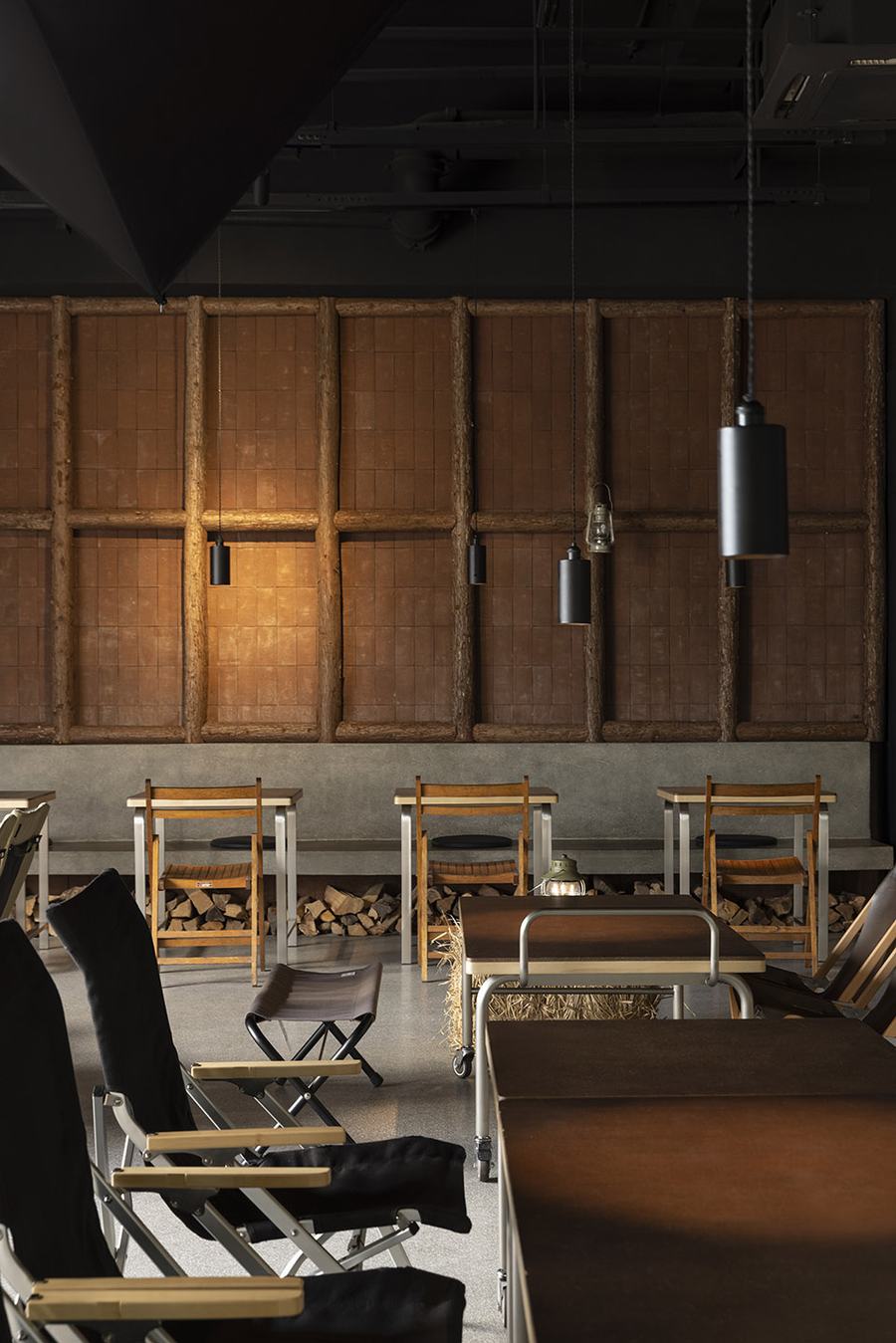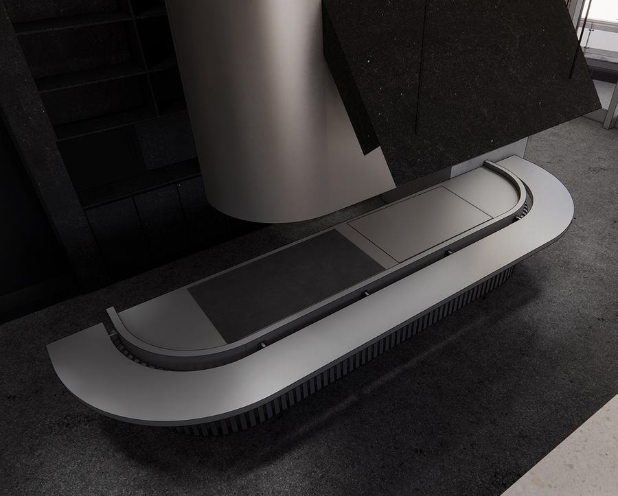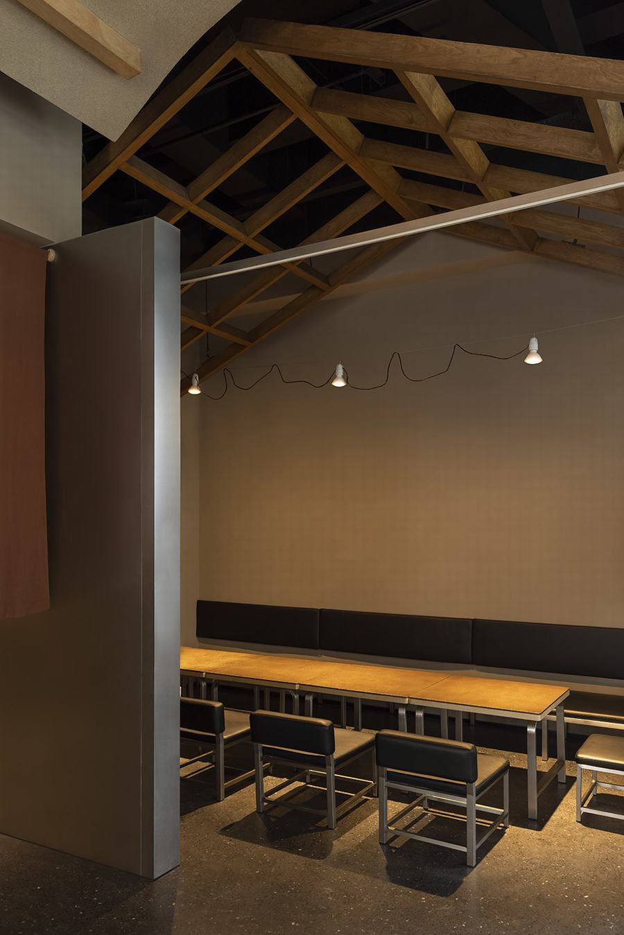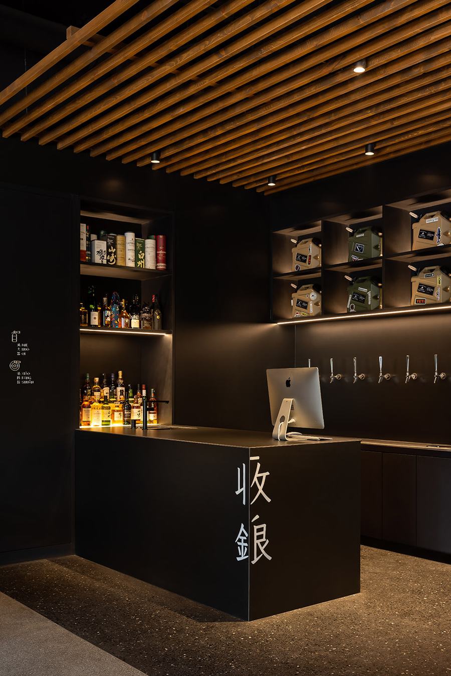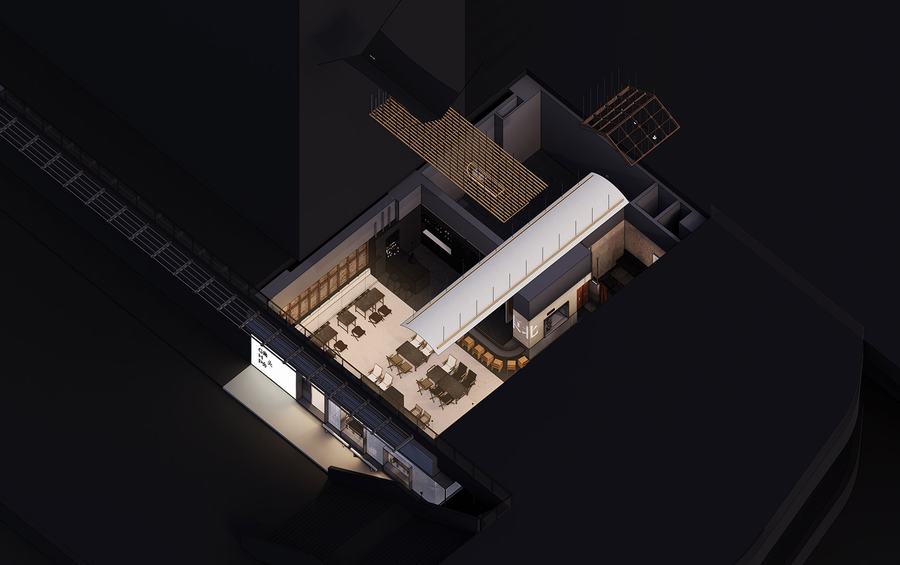 从照度上看,现烤吧台的面积在整个空间中是最高的,其屋顶与相关的照明相匹配。在这里,你可能会看到半嵌入木格栅的灯光照射在冰冷的黑色立面上,搭配金属色条和烟雾罩。顶面展现功能与色彩的完美结合,凸显单一金属的工业质感与严谨细节。黑色与金属色形成对比,平面与独立块体在材质上形成对比。