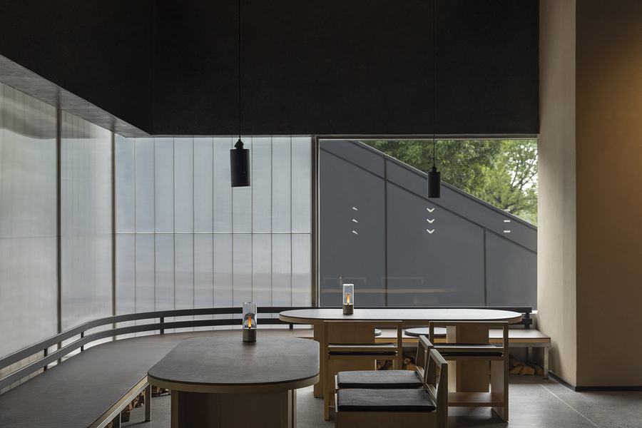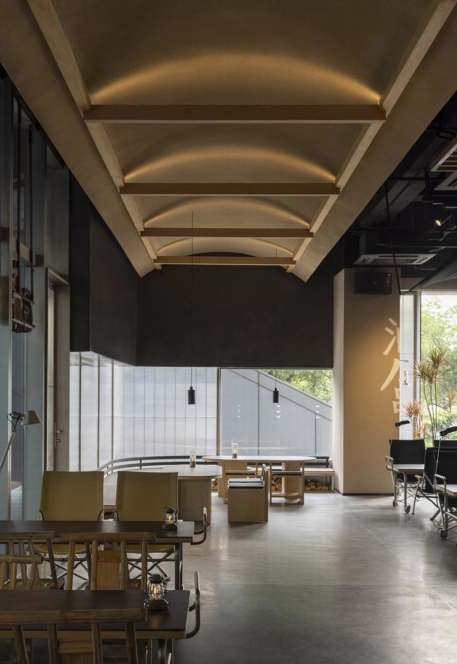 用顶面划分空间区域,区分不同的体验环境。各种材料和形式的组合创造了不同屋顶的交错形象,就像室外环境产生的一样。