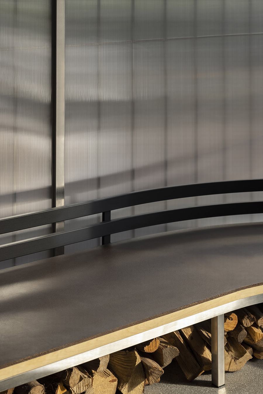 与开放区域的冷色调形成对比的是,走廊顶部有一个弯曲的沙色屋顶。从视觉上看,你可能会觉得穿过一个隧道,看到微弱的柔和的光流穿过苍白的木梁。这个区域由两个部分组成:靠窗的座位和对面的圆形部分。