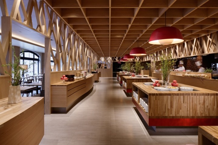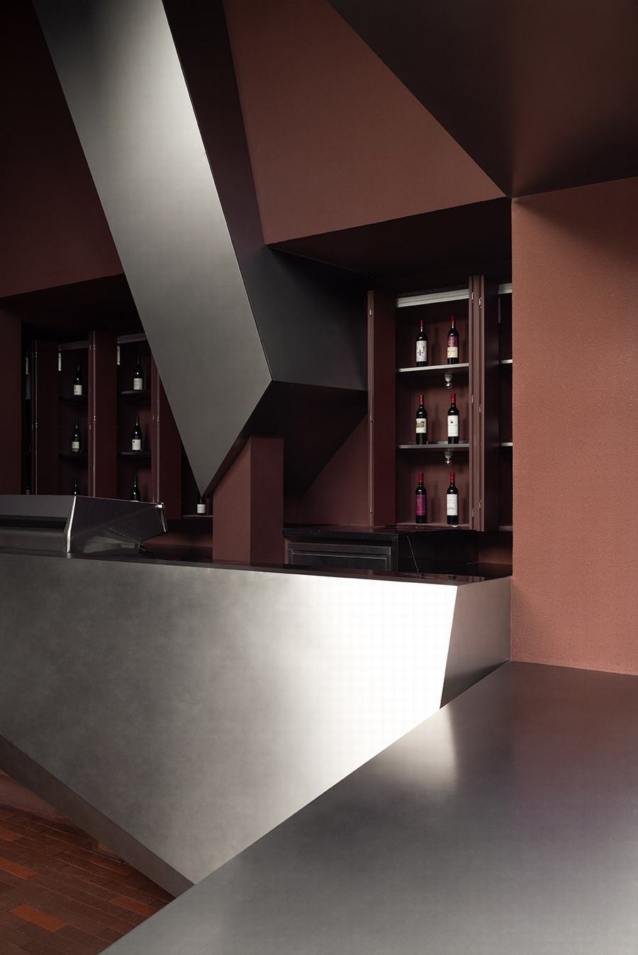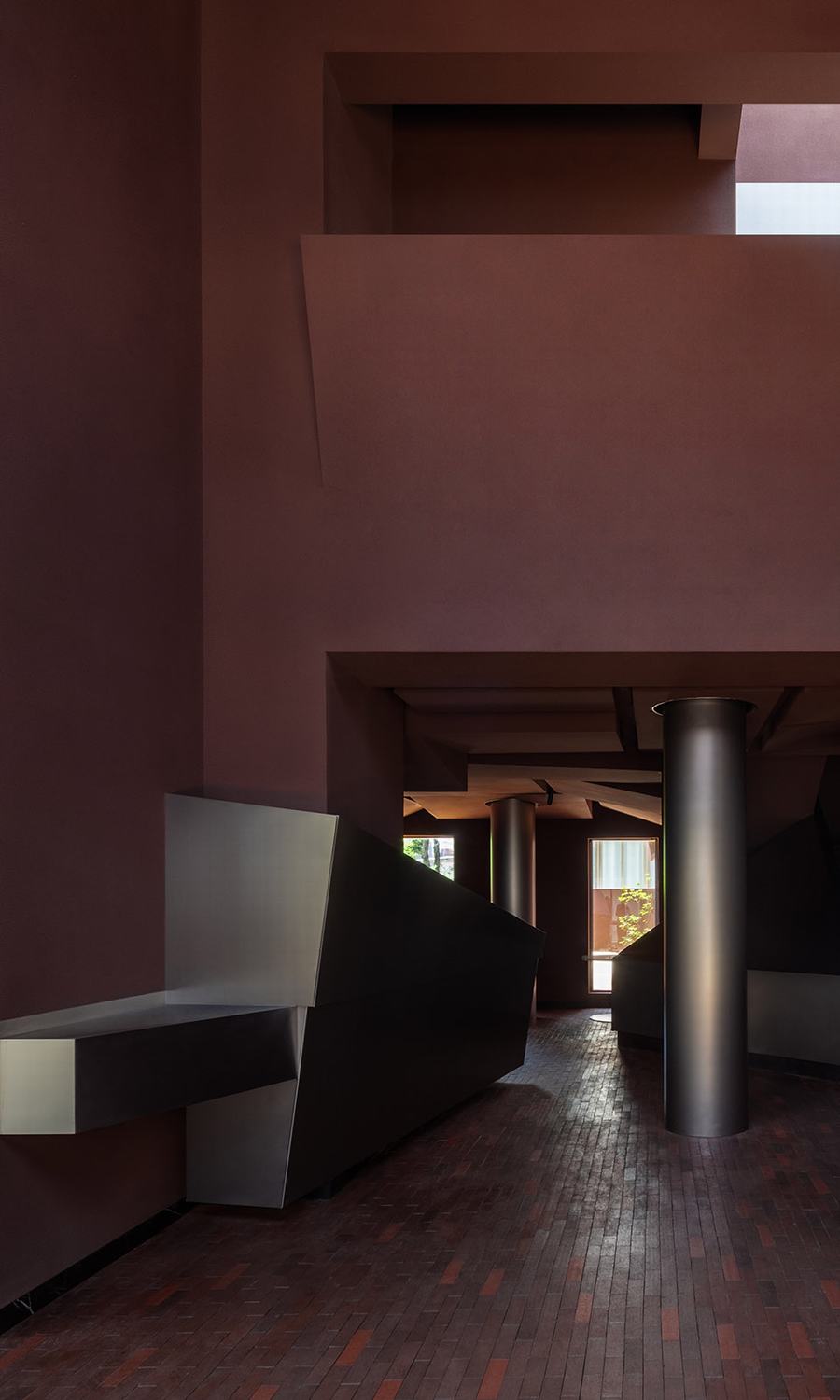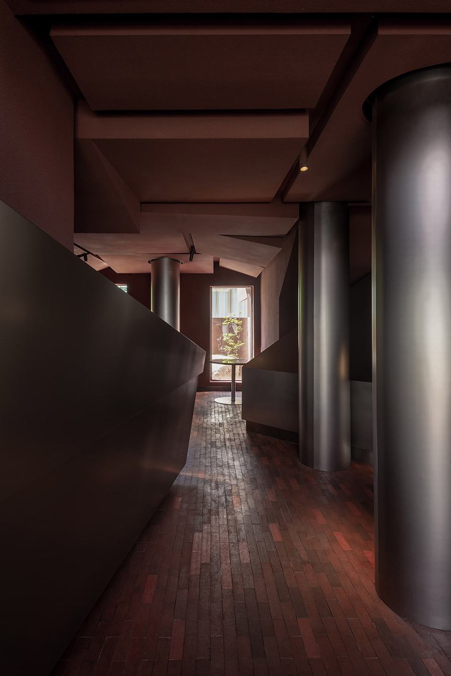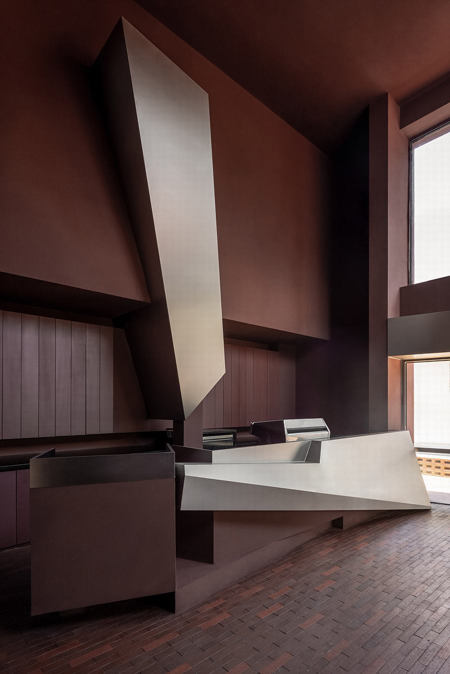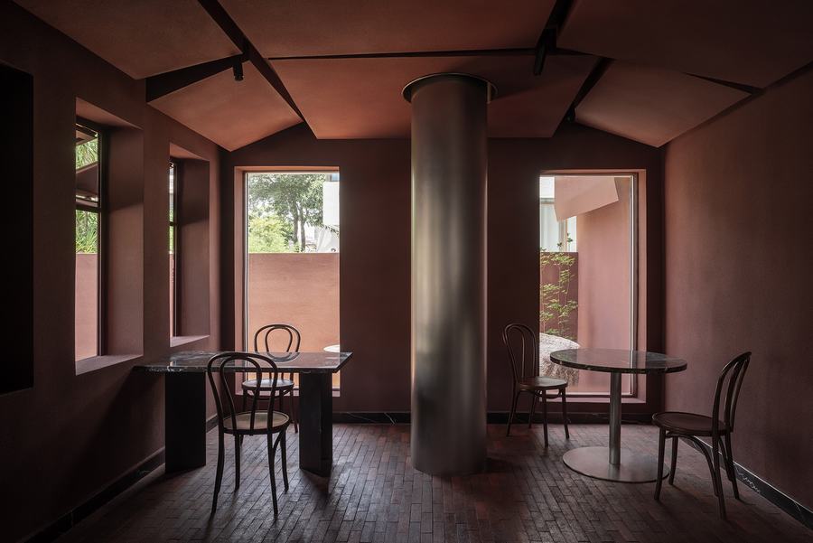 中庭的用餐区和咖啡区需要分开,设计师更喜欢用“块”来代替墙壁。异质块体的切割和堆叠,模拟了海洋与礁体之间密不可分的自然关系,从而形成更广阔的空间分区。