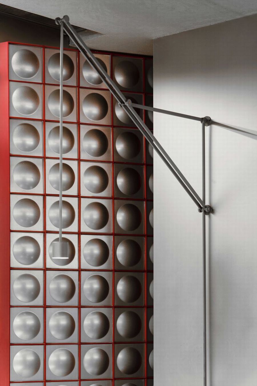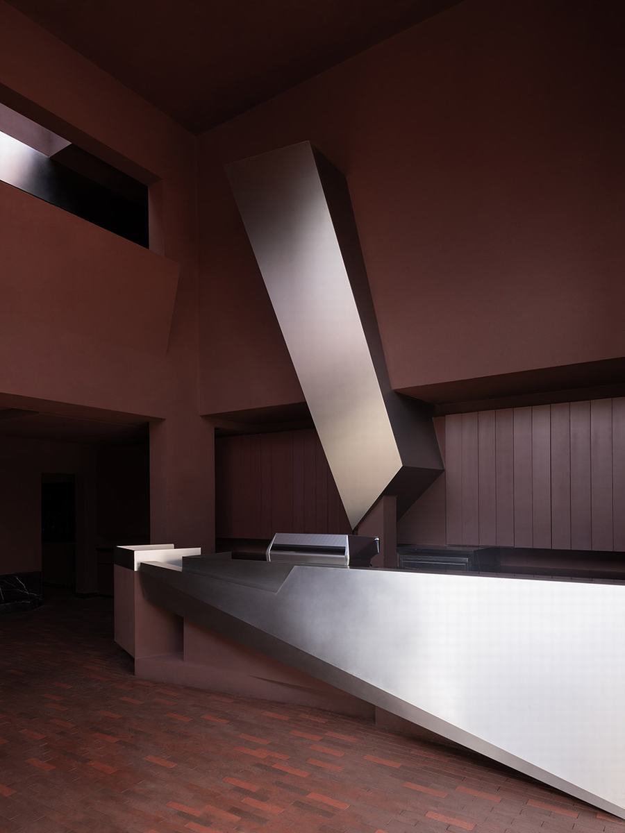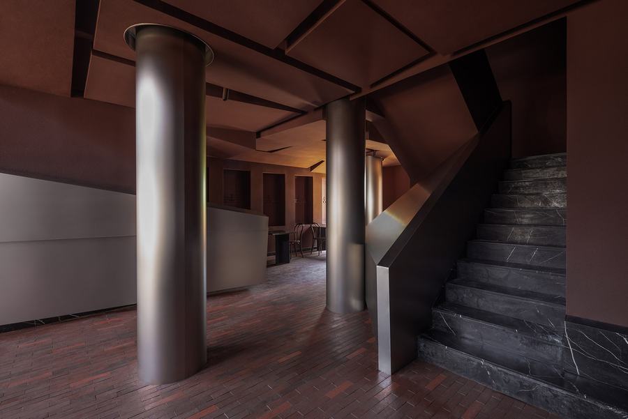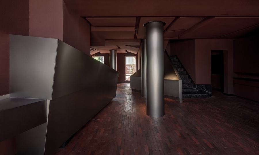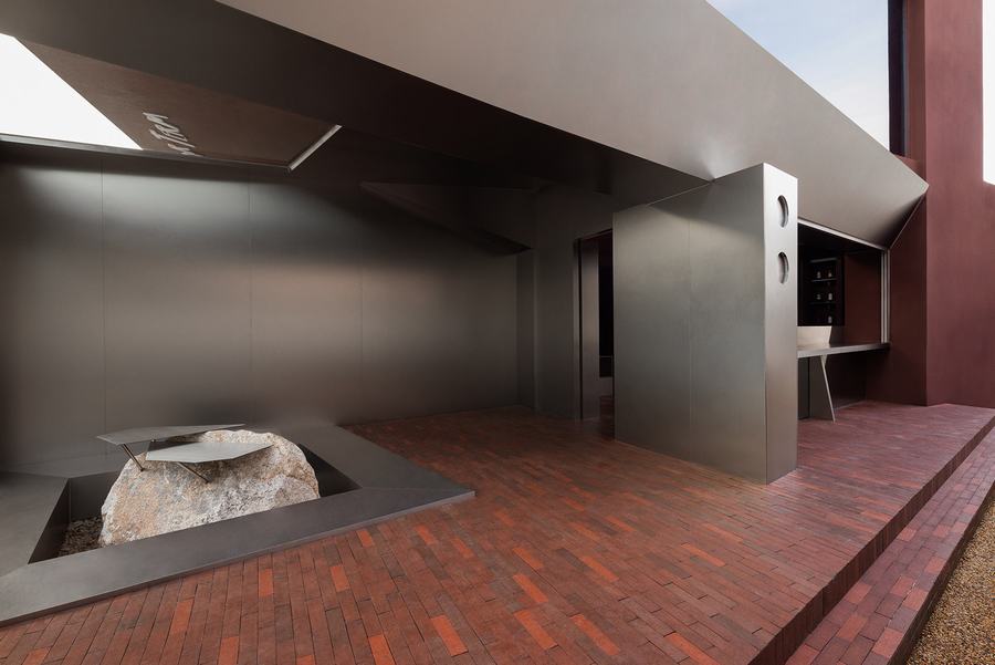 大面积的地面和墙面自然原始的纹理,让整体空间产生宁静柔和的感觉。添加的金属块让空间在纹理上形成“新”与“旧”的碰撞,视觉上的诠释更有层次感。